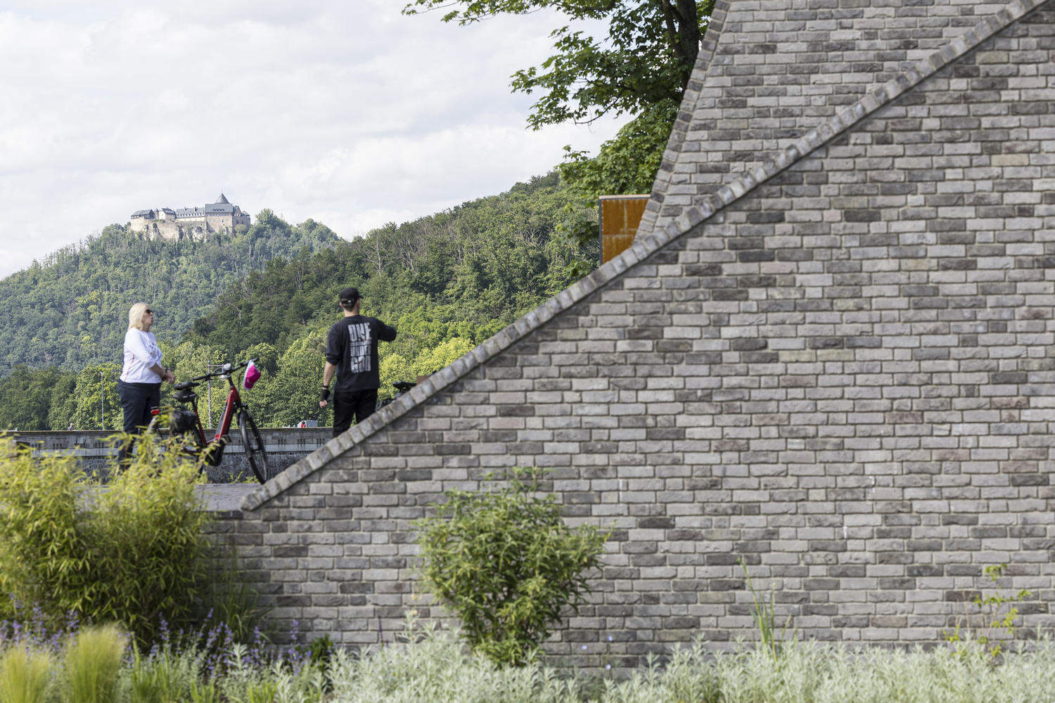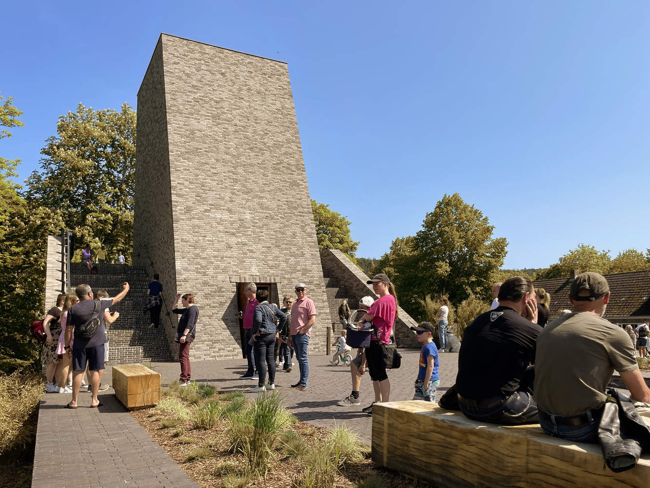Architectural Concept: A Symbolic Cut Through the Dam. The architectural design of Stones Water Light is inspired by a symbolic section cut through the dam, mirroring its form and revealing hidden inner spaces shaped by tunnels and shafts. The visitor centre acts as a physical and conceptual link between the central square of the village of Edersee and the dam itself, reinforcing its historical and cultural significance. The tower-like structure rises above the landscape, offering visitors panoramic views of the lake and dam. A large window in the foyer creates a visual connection to the dam, seamlessly integrating it into the interior experience.