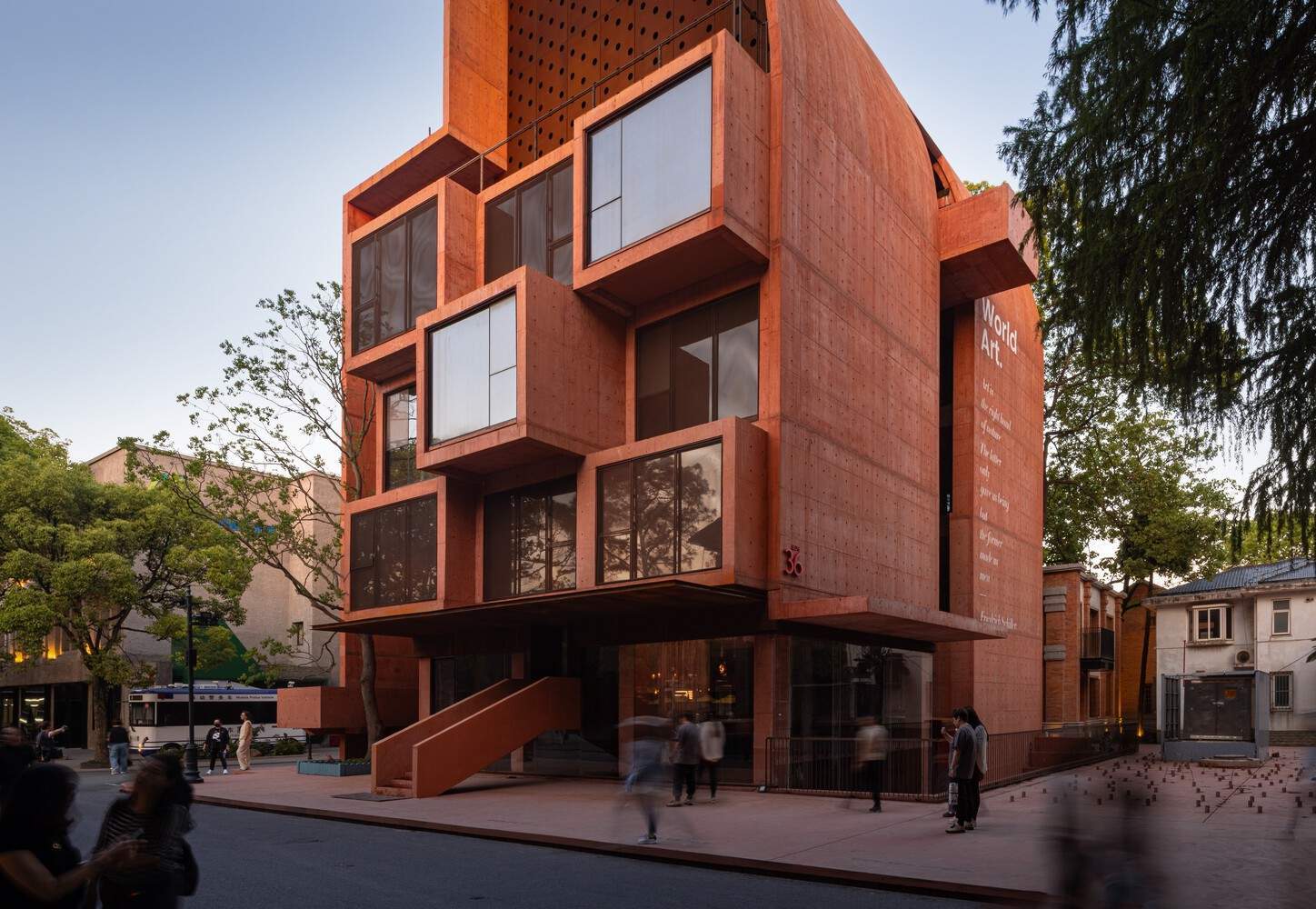The west facade of the building, with its cast-in-place concrete, exudes a sense of weight and solidity. However, the introduction of rectangular openings brings a breath of life to the structure. What could have been a continuous cut is ingeniously interrupted at the top, creating a subtle "brake" effect. The exterior terrace disrupts the original monotony of the facade. On the wall, a quote from the German poet Schiller is inscribed: "Art is nature's right hand. Nature only allows us to exist, but art enables us to truly become human." In this way, the building extends nature, while art fosters a resonance between nature and humanity.