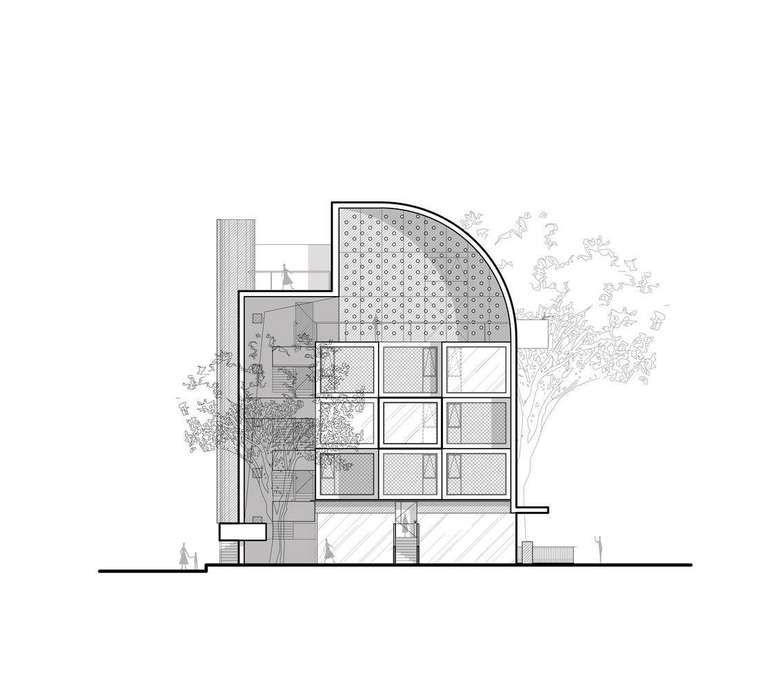东北角的原始树木被保留下来,以补充新旧建筑。明火逃生楼梯螺旋向上,蜿蜒曲折,既有曲线,也有直线,让人想起穿越时间的旅程——过去、现在和未来。该设计为清晰的视线留出了空间,让人体验到树木季节的变化。到达三楼后,人们可以凝视对面的BANCANG,树木形成了自然的分隔。继续向上,屋顶钟楼映入眼帘,每一步都提供了一个新的视角。