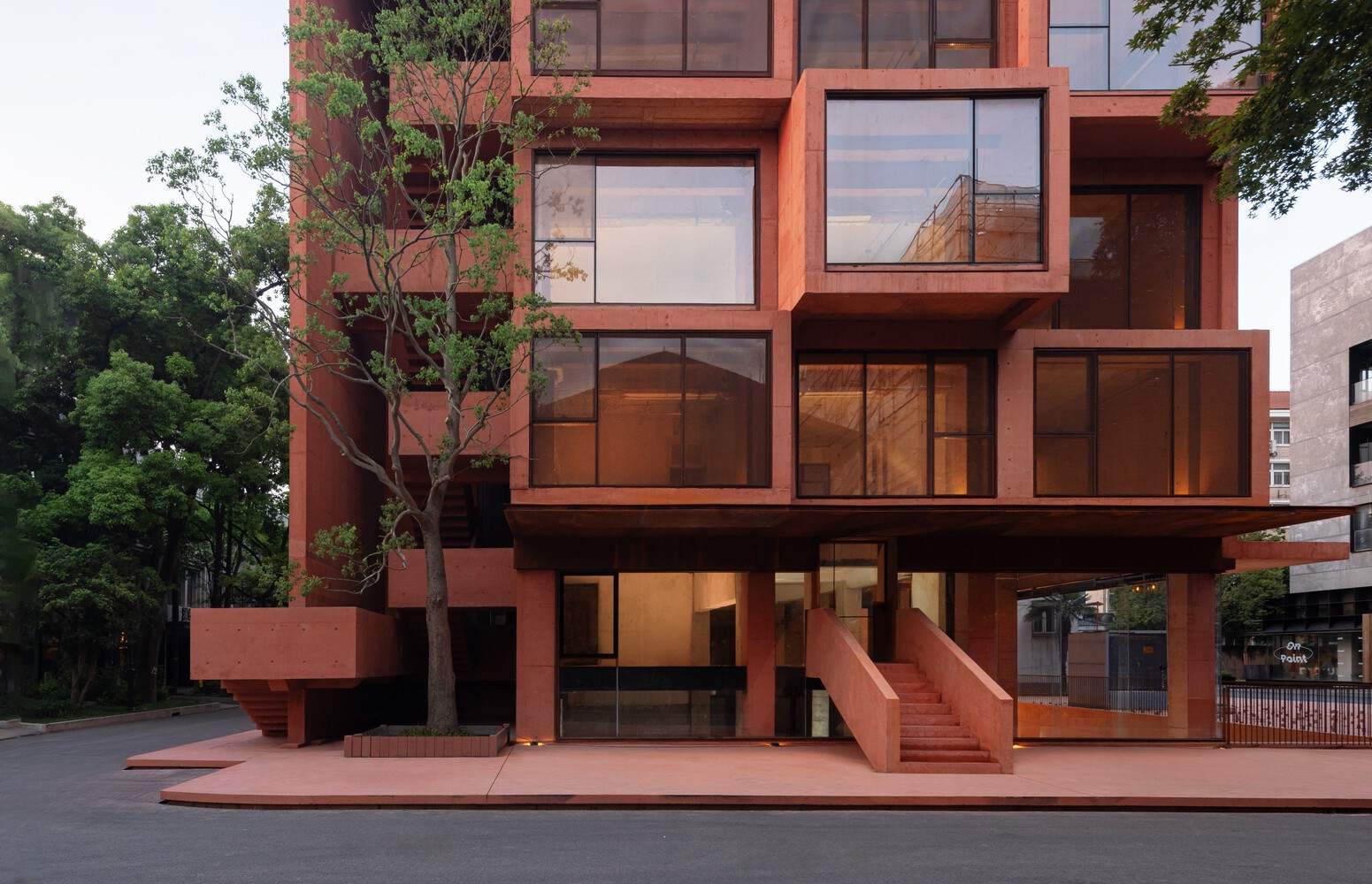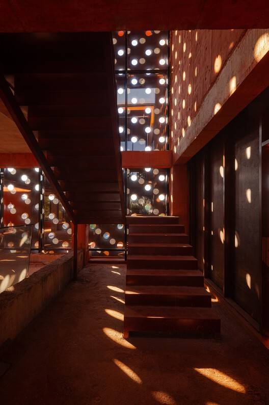 新旧对话与空间叙事:该项目最引人入胜之处在于其对历史文脉的尊重和创新设计语言的巧妙融合。建筑师保留了原建筑的核心结构,通过“包裹、交织、联锁、堆叠和蜿蜒”等手法,创造了一种穿越时空的体验,新与旧的对话贯穿始终。 材料的运用是另一个亮点,赤土色混凝土与风化钢板的结合,既保留了历史的质感,又赋予了建筑现代的审美。切割与重塑的设计手法,在不改变原有建筑框架的基础上,重新定义了空间关系,使内外空间流畅连贯,这种空间叙事方式让建筑本身充满了故事性,引人入胜。