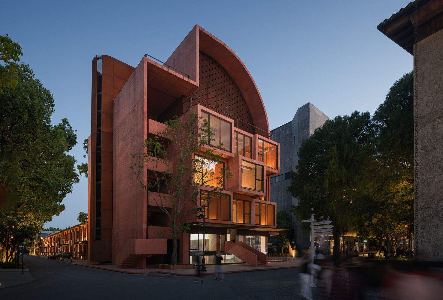 A Sail on the Vast Sea preserves the original building's core structure. The entire architectural mass is shaped through various methods such as wrapping, interweaving, interlocking, stacking, and meandering, thereby creating a sense of time and space travel, allowing the past, present, and future to engage in dialogue. The color scheme combines terracotta-toned concrete with weathered steel panels, and the interplay of light and shadow enhances the rich history that the old building has accumulated over time.