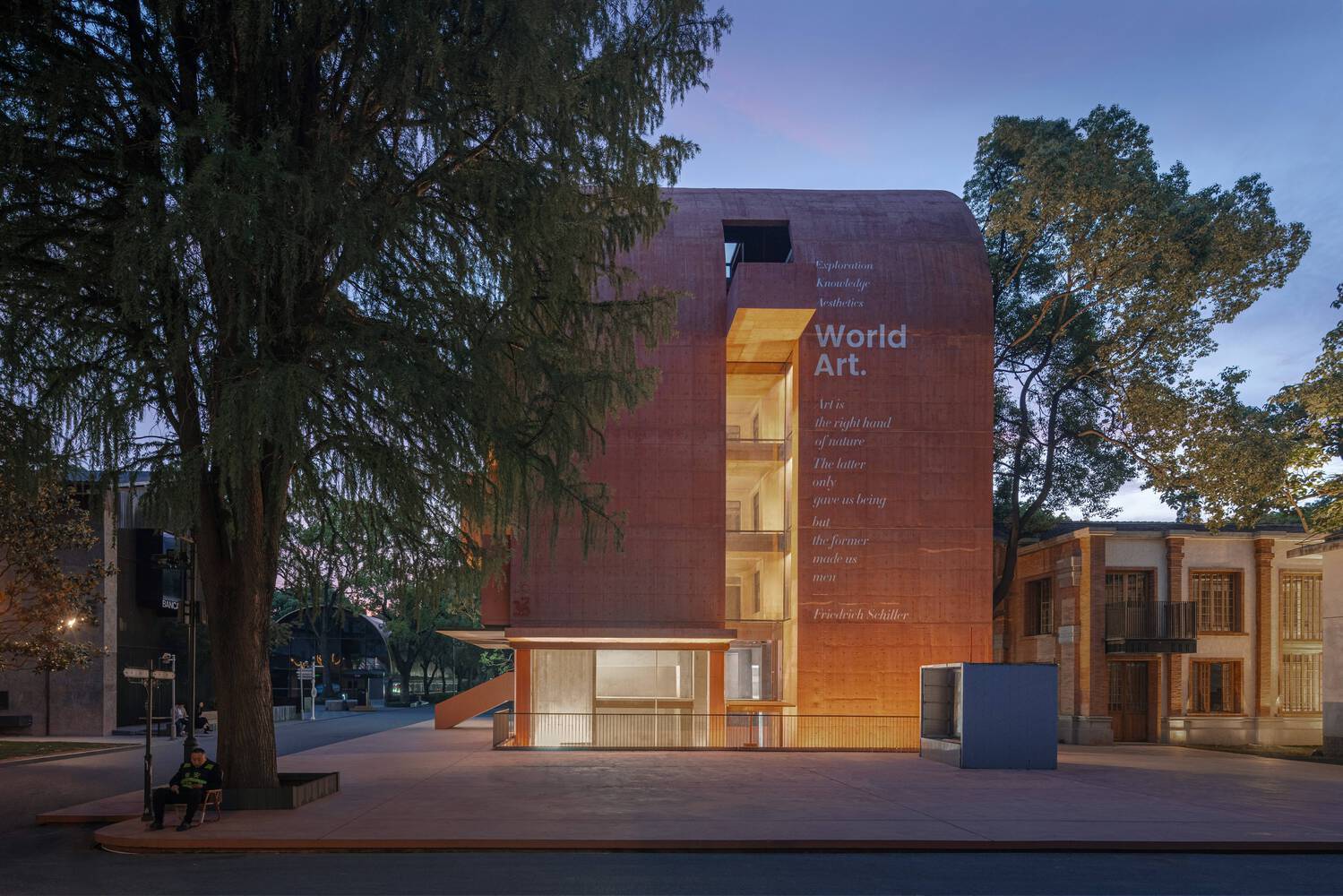 建筑的西立面采用现浇混凝土,散发出一种重量感和坚固感。然而,矩形开口的引入为结构带来了生机。原本可能是连续切割的东西在顶部巧妙地被打断,产生了微妙的“制动”效果。外部露台打破了立面原有的单调。墙上刻着德国诗人席勒的名言:“艺术是自然的右手。自然只允许我们存在,但艺术使我们真正成为人。”通过这种方式,建筑延伸了自然,而艺术促进了自然与人类之间的共鸣。