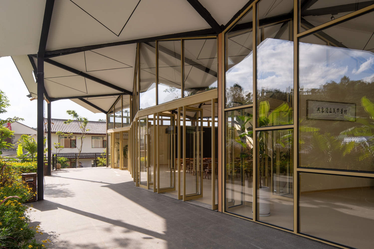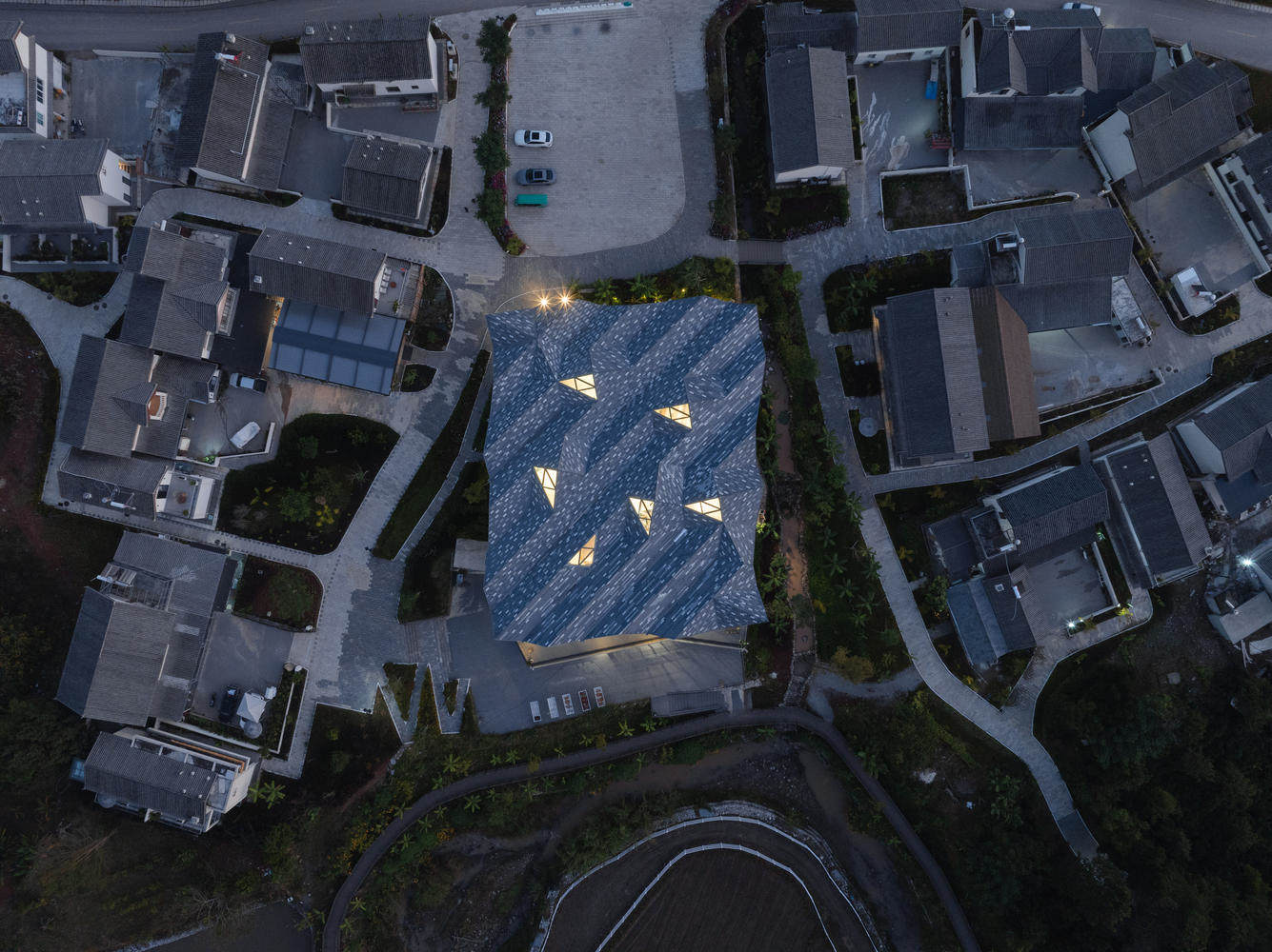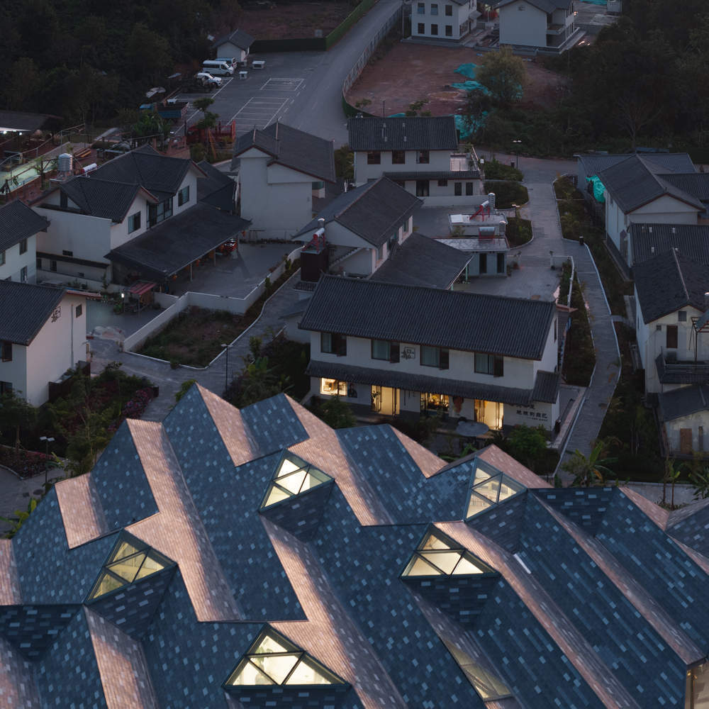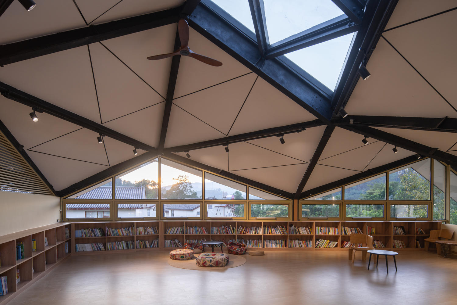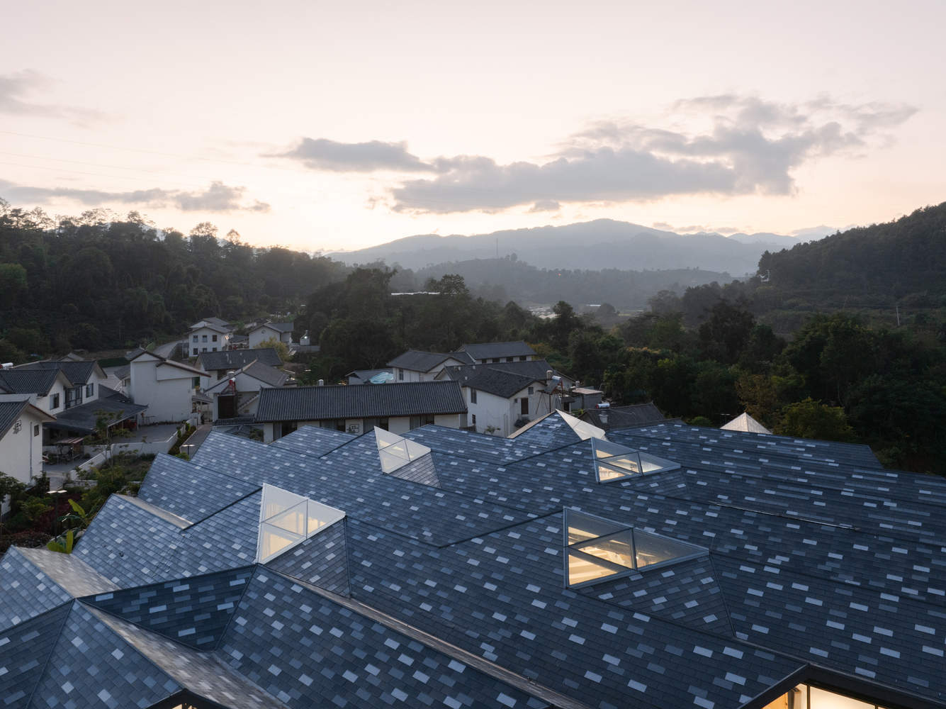 应对气候条件的建筑设计:该项目最突出的亮点之一在于其对云南当地气候条件的巧妙应对。建筑师采用的折叠板屋顶设计,不仅实现了有效的雨水导流,还通过倾斜角度减少了阳光直射,为室内提供了阴凉。更重要的是,屋顶天窗的设计模拟了热带雨林的斑驳光线效果,为室内空间营造了自然、通透的氛围。这种设计策略不仅满足了建筑的功能需求,更将建筑与周围环境融为一体,体现了对环境的尊重和对人居体验的细致考量,充分展现了建筑与自然的和谐统一。