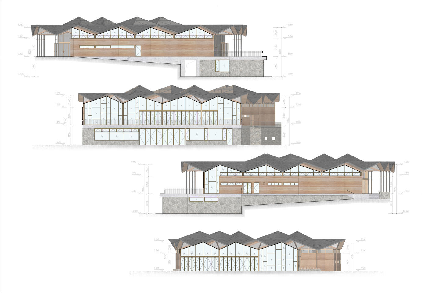 1.应对气候条件。滇南属于热带雨林气候,阳光充足,雨量充沛。为了适应这些条件,我们设计了一个延伸的折叠板屋顶。这种屋顶不仅确保了有效的排水,而且通过其倾斜的形状减少了阳光直射,为室内提供了遮荫。此外,天窗被纳入屋顶,与内部功能相对应。这些天窗允许自然光进入空间,模仿热带雨林的斑驳光线效果。这种设计不仅满足了功能需求,还营造了一种自然、身临其境的空间氛围。