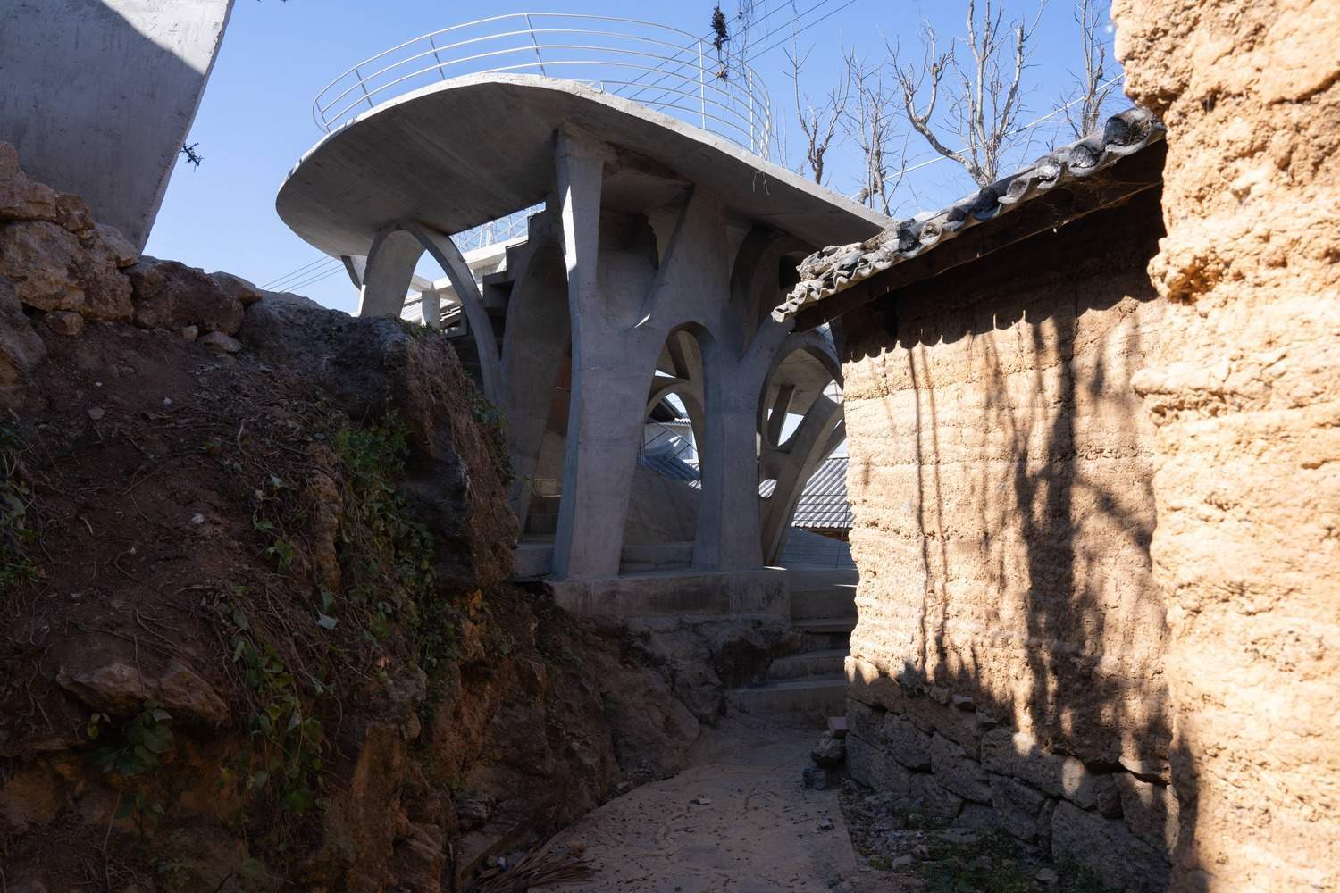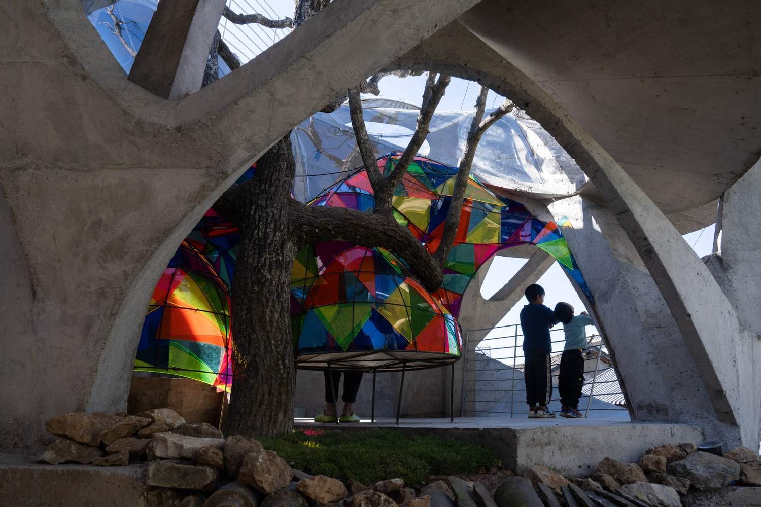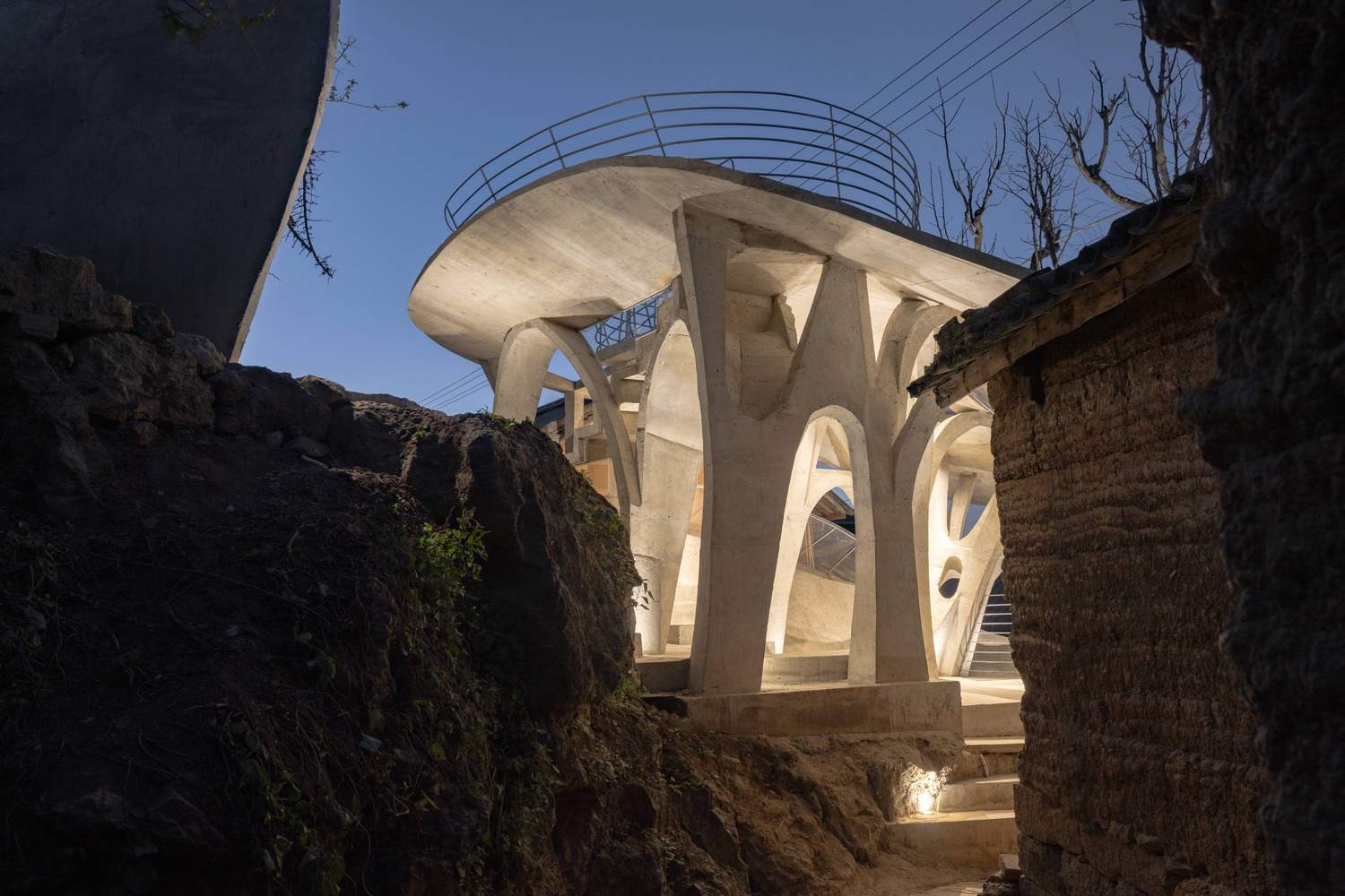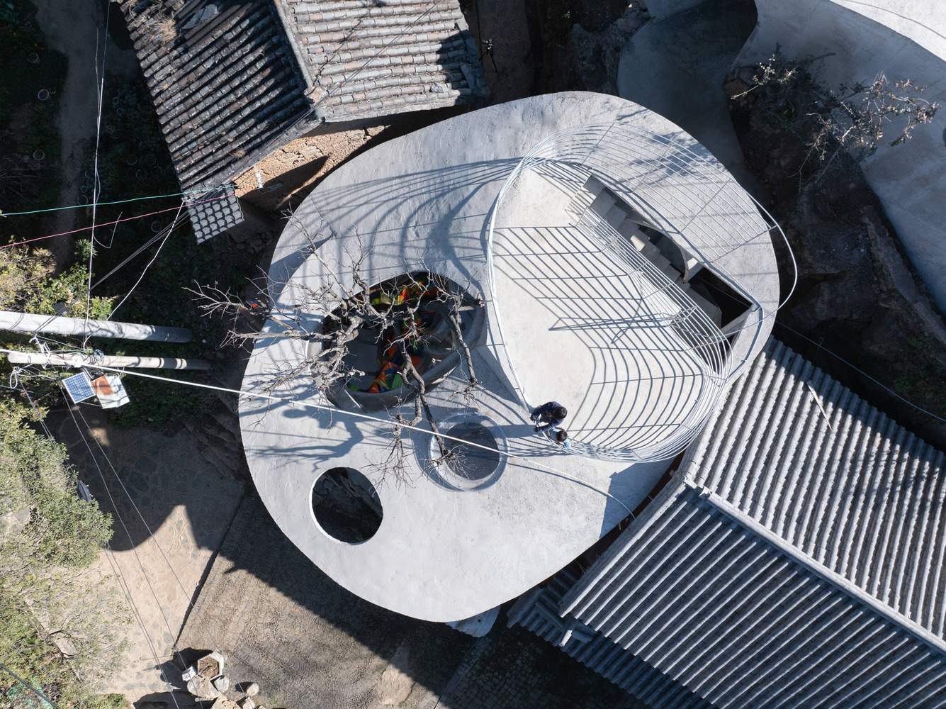 Symbiosis with Nature: Dialogue with the Raisin Tree - Under tight constraints of time, space, and preservation of the ancient tree, the design adopts an improvisational approach. Collaborating with local artisans, 12mm ribbed steel bars were woven into branch-like arches, cantilevering from the roof to form a dual canopy with the tree's crown. Cast-in-place concrete vaults replace traditional "thatch-and-earth" materials, ensuring resilience while evoking primal shelter. The overlapping circular roofs, reminiscent of mushrooms native to the region, infuse playful symbolism into the structure.