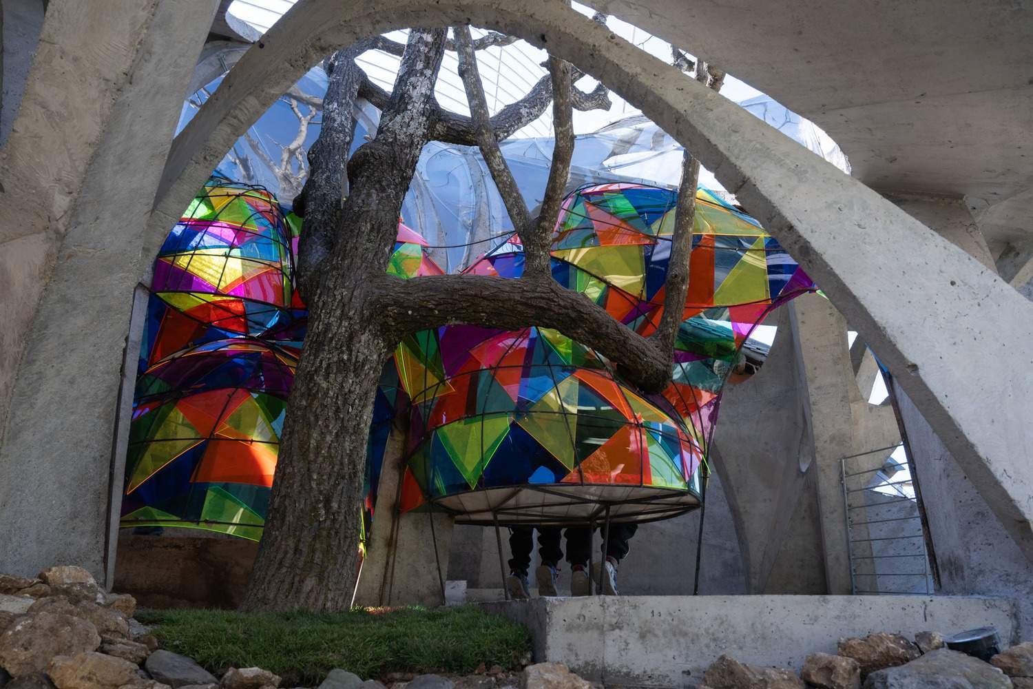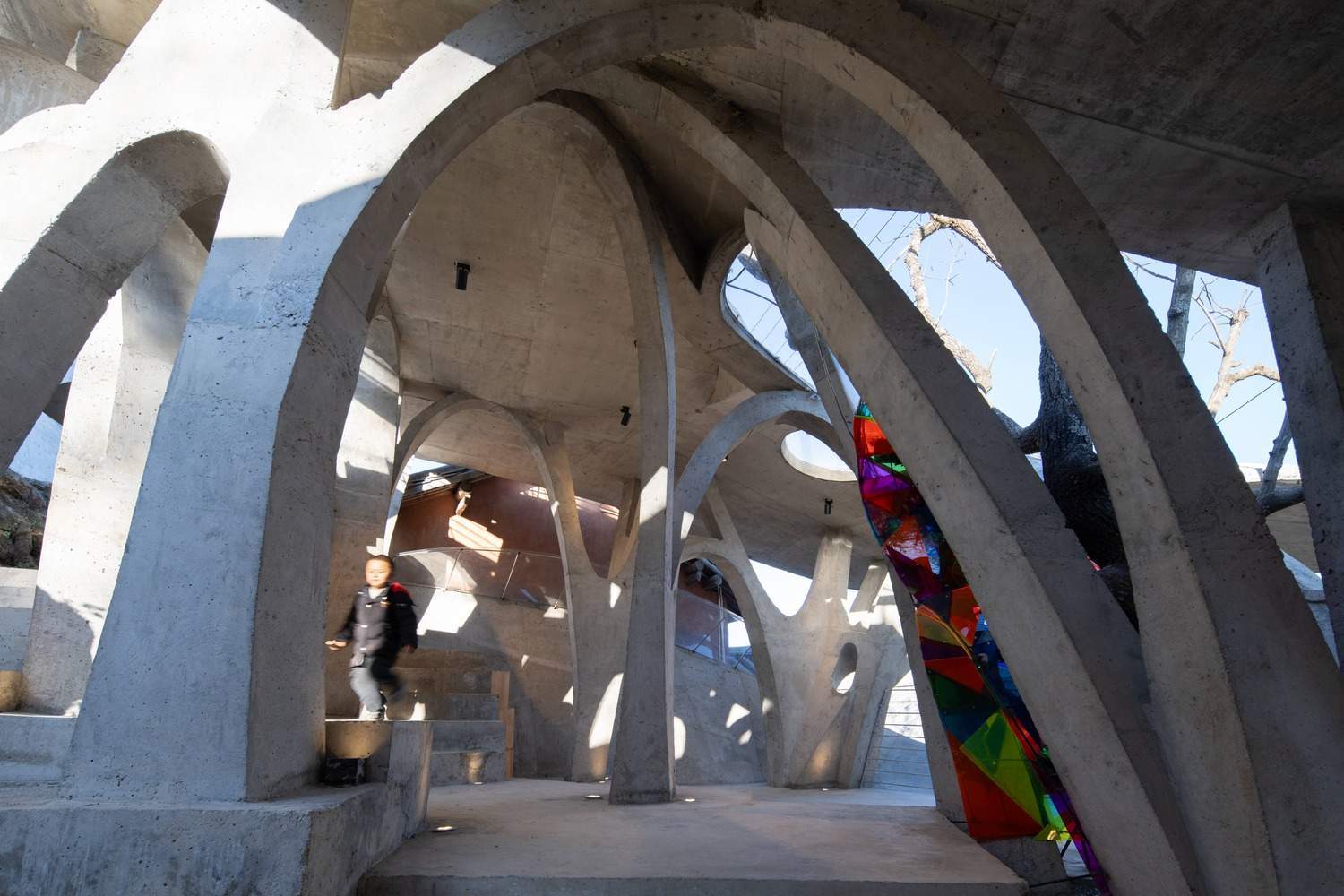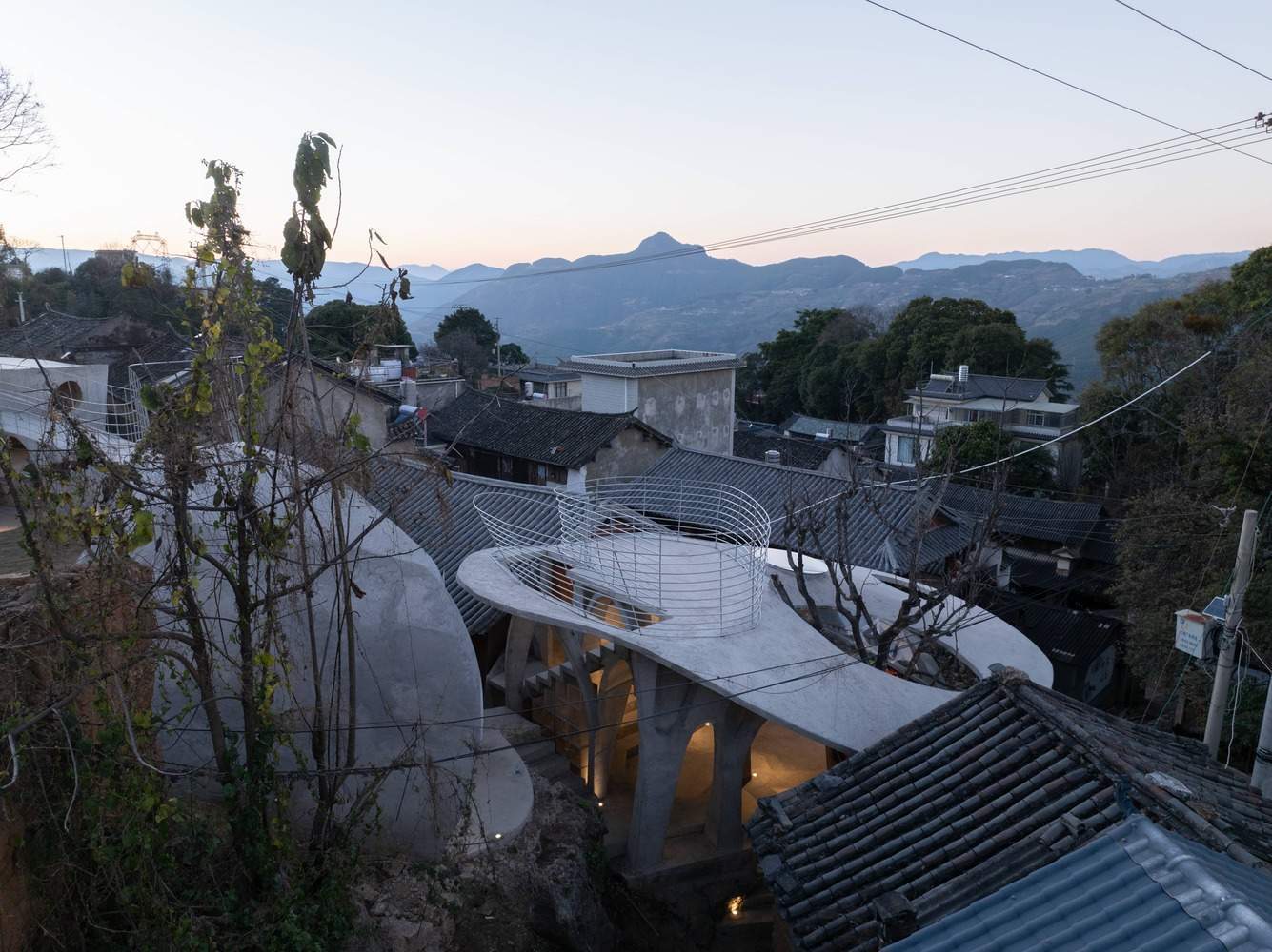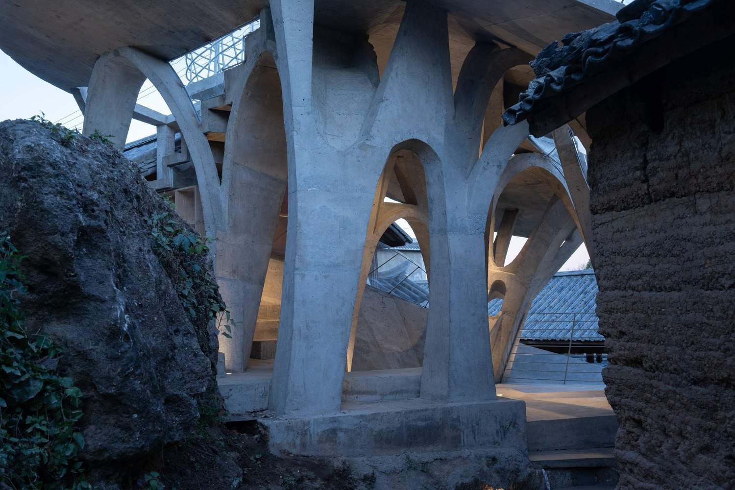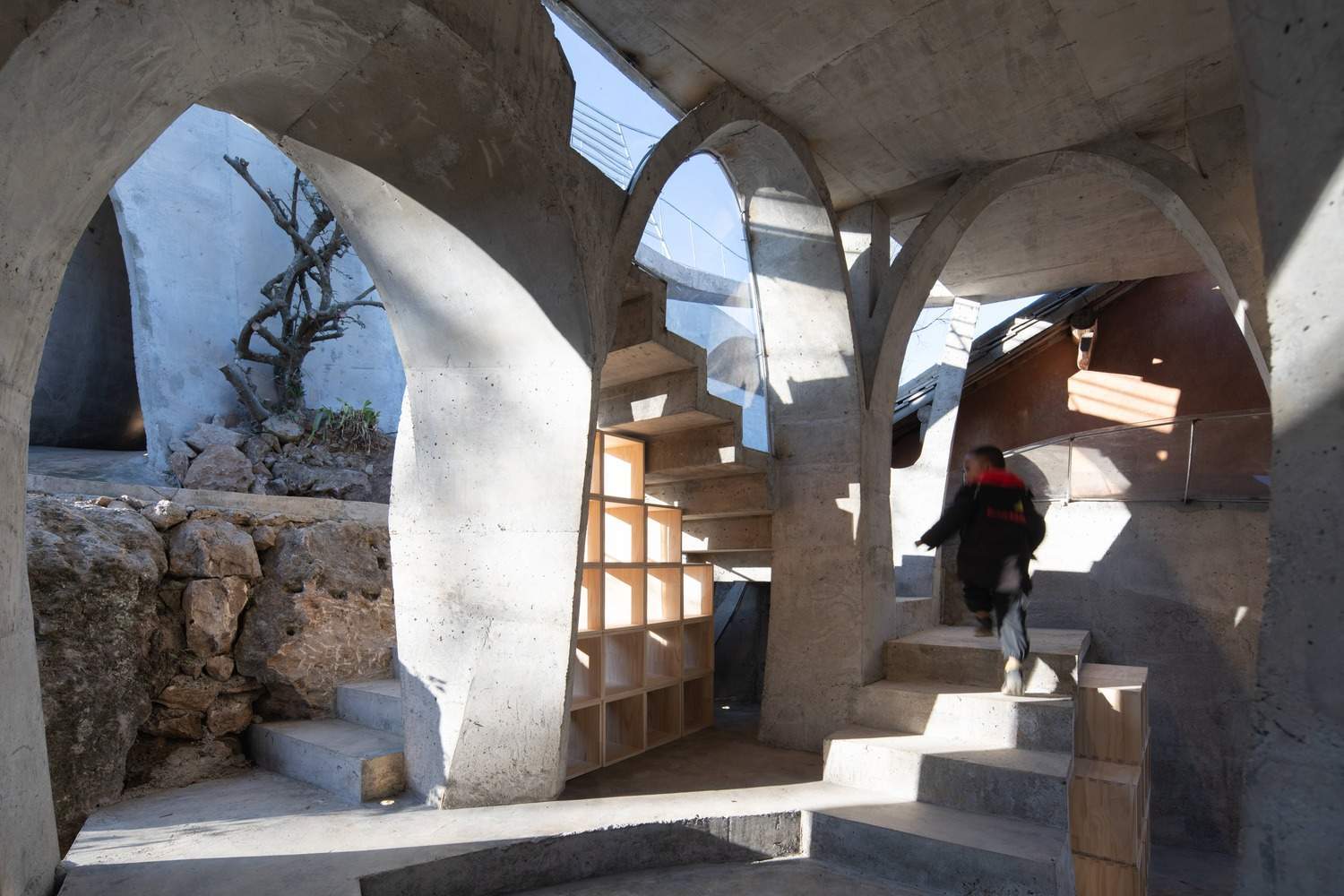 Symbiosis with Nature: Dialogue with the Raisin Tree - Under tight constraints of time, space, and preservation of the ancient tree, the design adopts an improvisational approach. Collaborating with local artisans, 12mm ribbed steel bars were woven into branch-like arches, cantilevering from the roof to form a dual canopy with the tree's crown. Cast-in-place concrete vaults replace traditional "thatch-and-earth" materials, ensuring resilience while evoking primal shelter. The overlapping circular roofs, reminiscent of mushrooms native to the region, infuse playful symbolism into the structure.