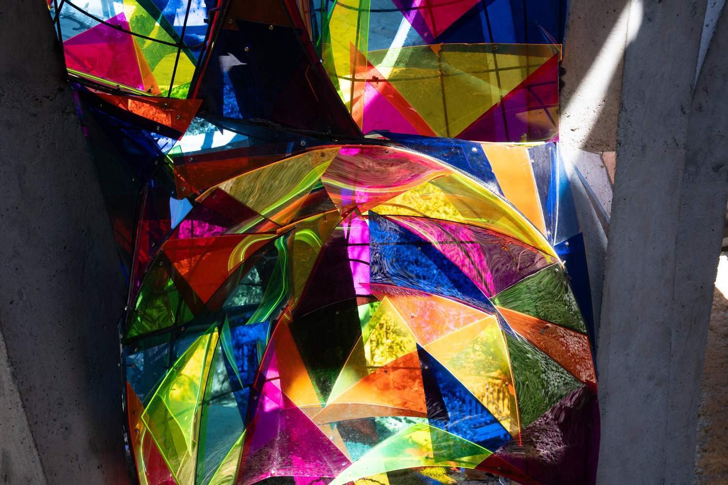 Light as Narrative: A Dynamic Theater - Natural light filters through preserved tree hollows, a central oculus, and stair voids, animating the space with ever-shifting patterns. Arched steel columns cast dendritic shadows, while semi-spherical bookshelves—woven from 6mm steel rods and clad in translucent, color-saturated acrylic panels—scatter kaleidoscopic reflections. A sloped curved wall serves as seating, where children recline to watch sunlight traverse the space, transforming the book house into a "living theater" of light and time.
