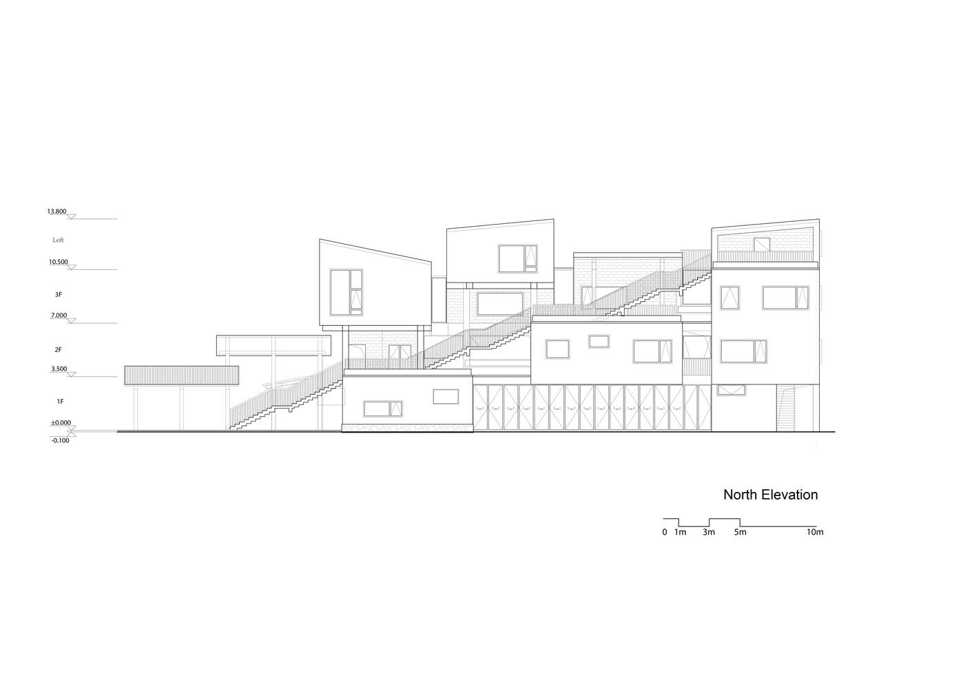 空间序列与人文体验:项目在空间组织上展现了卓越的设计能力。折叠楼梯的设计是其亮点之一,如同山间小径般蜿蜒,连接了公共广场与各个楼层,巧妙地将功能与社交空间融合。这种设计鼓励了社区互动,创造了一个灵活多变的空间,可以适应社区的发展和变化。楼梯的设计不仅解决了交通问题,更重要的是,它促进了人、空间和功能之间的对话,提供了比传统立面更具活力和参与感的体验。这种空间序列的设计,使得建筑不再是冷冰冰的容器,而是一个充满人文关怀的场所。