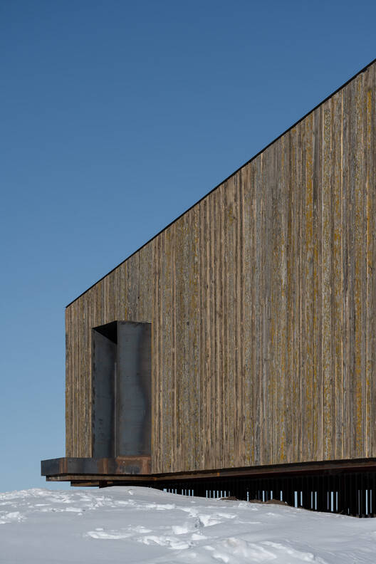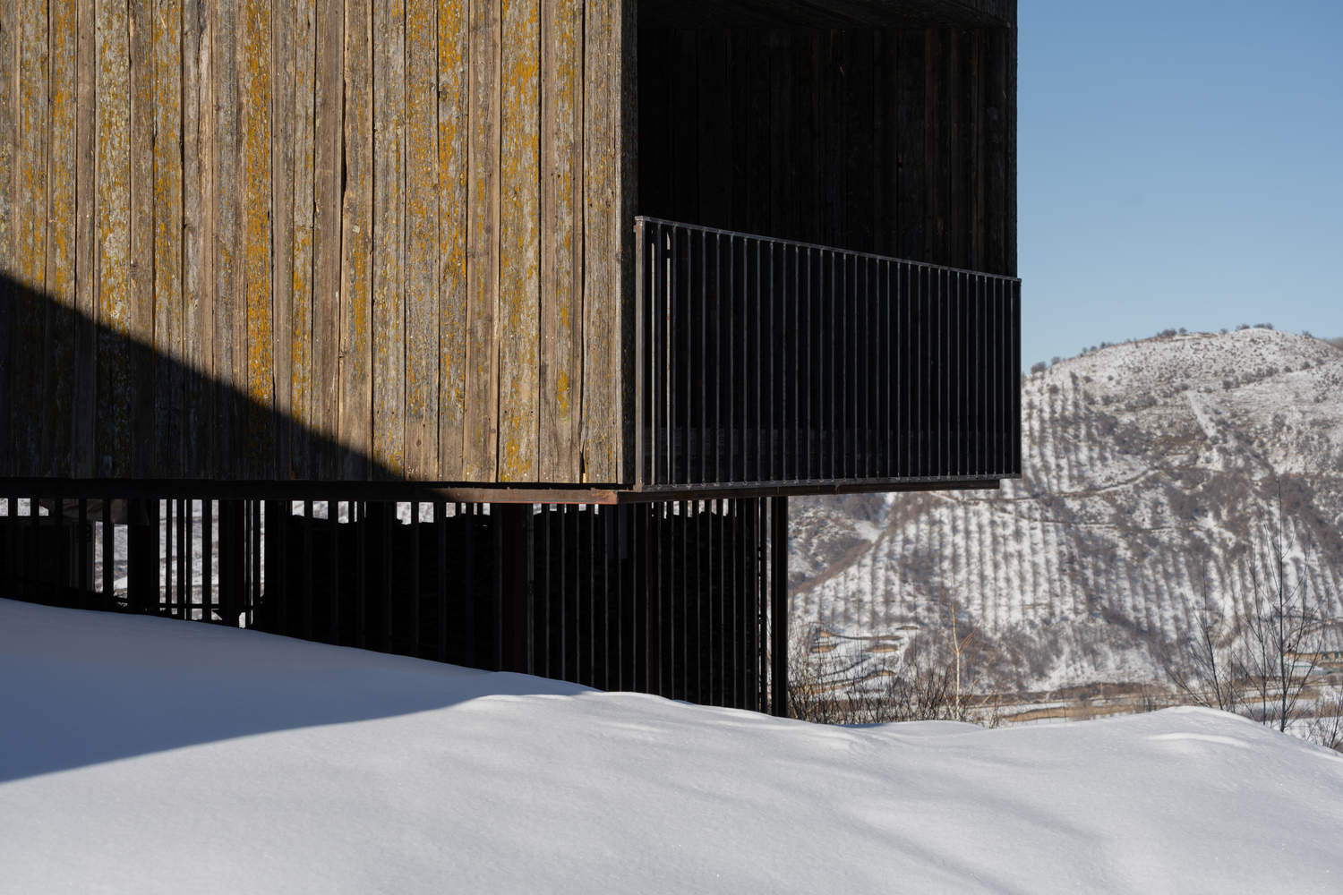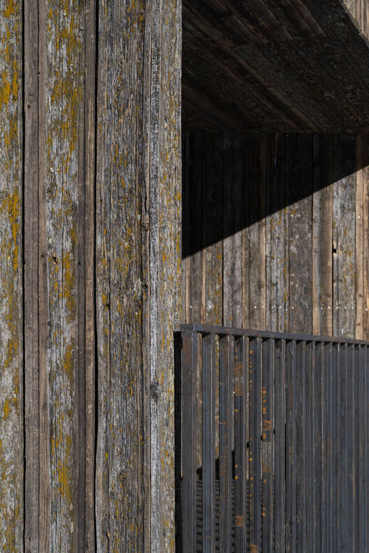 材料的再利用与文化传承:项目的另一个亮点是对于旧材料的创新性运用。建筑师亲赴阿尔泰山,挑选来自破旧房屋的古老落叶松木板作为外立面材料。这些木材不仅具有独特的质感和历史痕迹,更重要的是,设计师在收集、分类和安装的过程中,赋予了这些材料新的生命,也延续了当地的文化记忆。这种对旧材料的再利用,不仅体现了环保理念,也反映了建筑师对当地文化的尊重和对传统价值的传承,使小屋拥有了独特的历史厚重感。