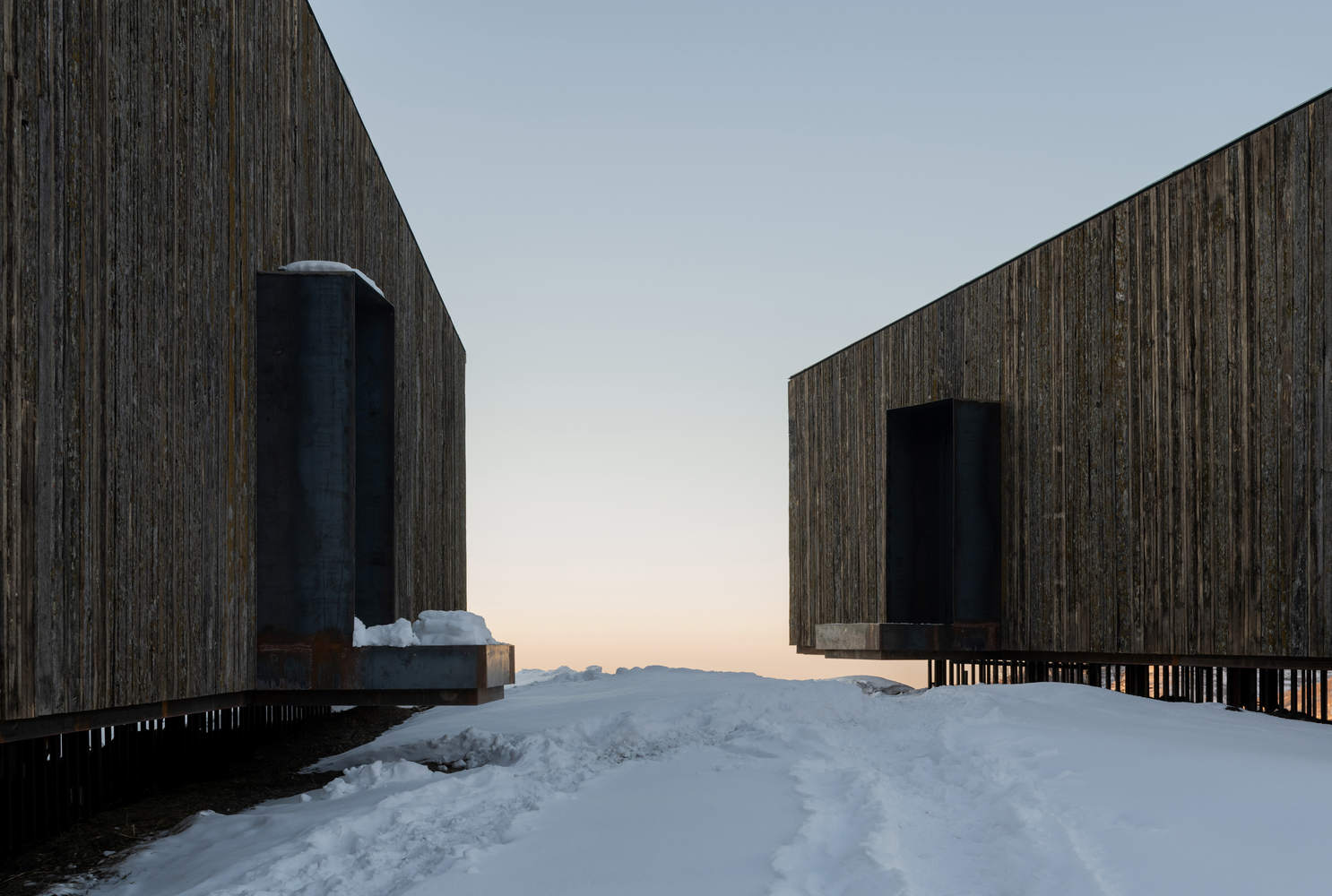 建筑师在阿尔泰山度过了两个夏天,亲自挑选了每块木板。他主要选择屋顶木材,因为它的质地更独特,封装了一个多世纪以来时间、苔藓和霉菌留下的各种痕迹。各种各样的木板被运到全国各地的新地点,连同旧钉子,然后分类并安装在外墙上。