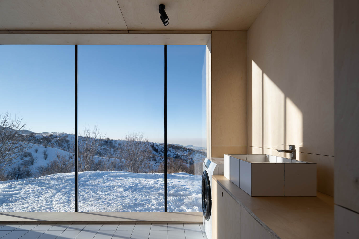 The two cabins have different layouts and play different roles. The first one has two separate bedrooms with floor-to-ceiling panoramic windows facing east that share a small bathroom. The second one features a kitchenette, a living room with a library, and an airy bathroom with stunning views of the west-side mountainscape.The living room revolves around a wood-burning metal stove surrounded by textured emerald and dark-blue tiles. The guests can gather around the fireplace, enjoying their chiny bowls of herbal tea while sitting down on the syrmaq, a traditional felt carpet with ethnic patterns. Both the tiles and the carpet are handmade by local craftsmen.