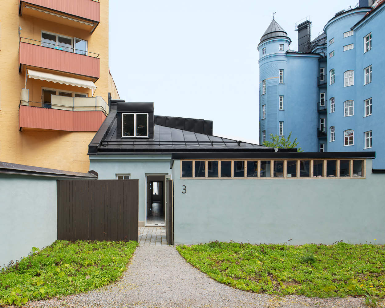 To create a private garden separated from the car park's floodlights and noise, a new wall is placed at the property boundary, like the surrounding retaining walls. Inside the retaining wall, a green oasis is created with climbing plants along the walls, which gives the largely single-sided building pleasant views and good outdoor environments despite the proximity to the car park. Bicycle storage and storage are placed against the wall to allow the building to stand on its own, which also provides beautiful and functional entry points at the entrance to the property. The project enables the building to be brought back into use through a clear and respectful renovation where the original character is highlighted and brought to life with well-chosen interventions that enable good function for housing and offices, but also a beautiful building for a long time to come.