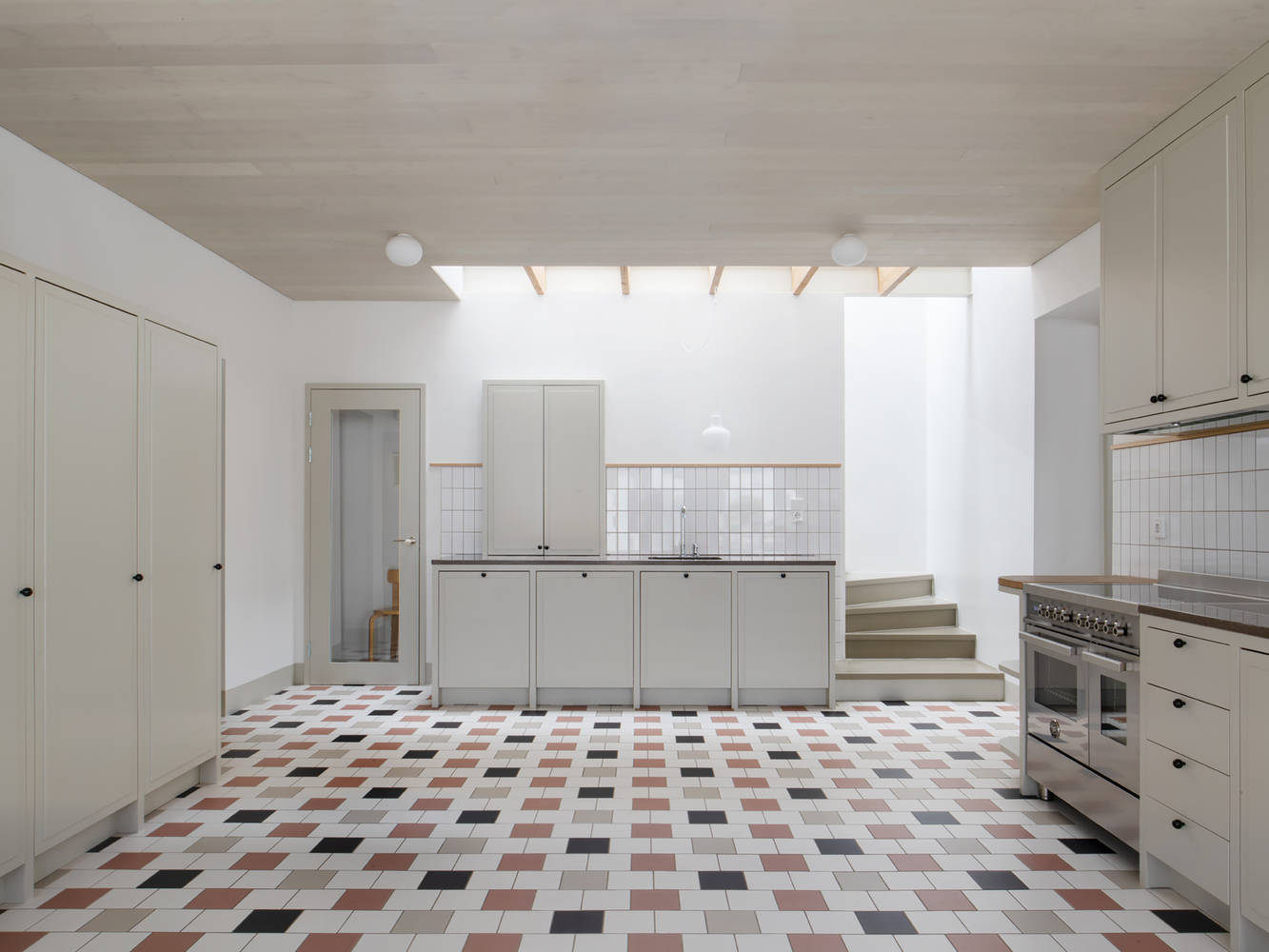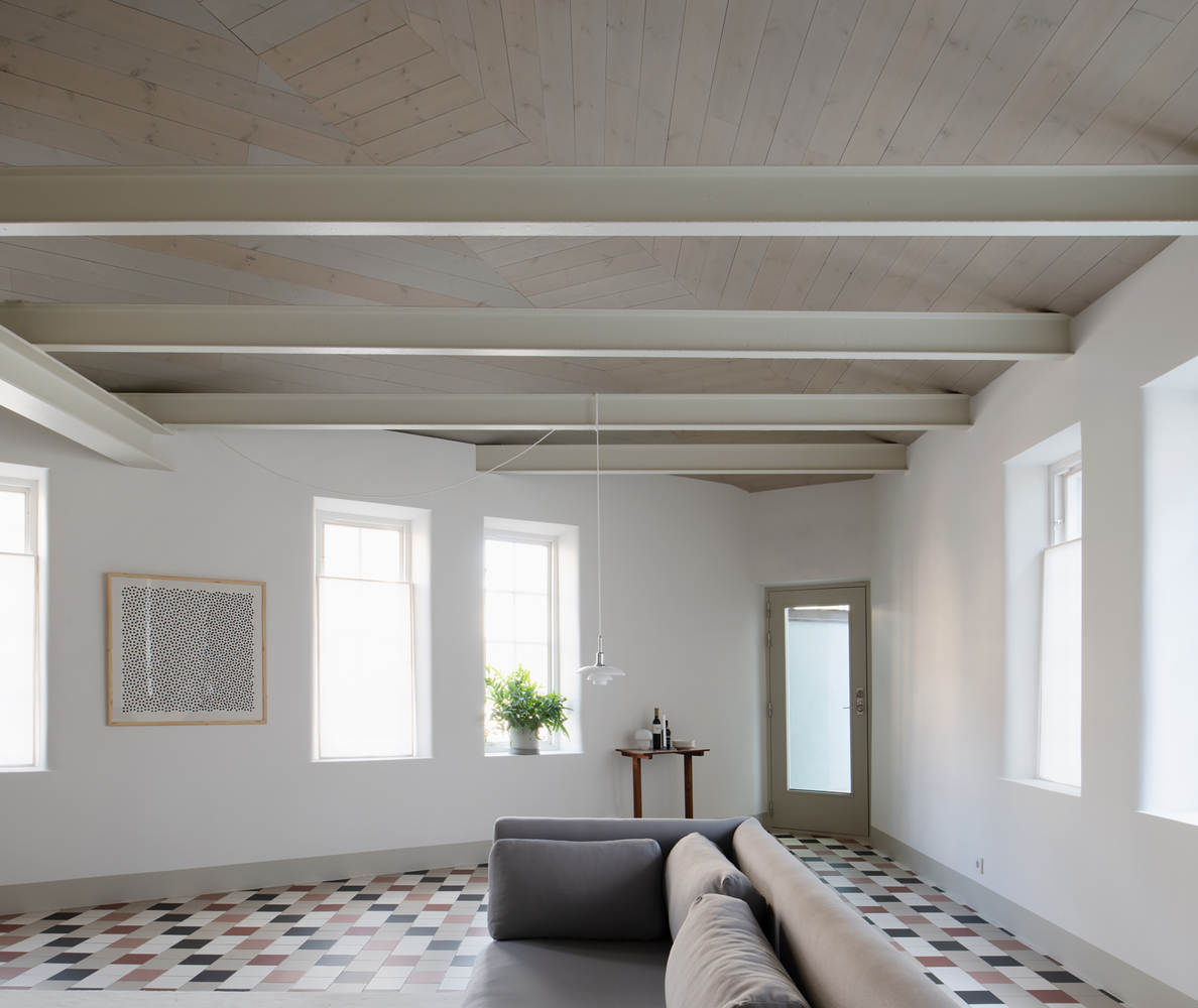 The roof sheet is in poor condition and is being replaced with a new folded roof sheet as existing, with the height of the eaves and gutter maintained. The existing roof shape is preserved with the addition of a new dormer to the southwest and an angled part of the roof to the southeast to furnish bedrooms in the attic. Facing Börjegatan, the roof retains its existing appearance, and underneath is placed the living room of the home with full ceiling height and visible existing roof structures. At the back of the neighboring property, a generous skylight is placed, which provides daylight to the stairs and kitchen; an unexpected quality in the otherwise single-sided rooms. A new chimney for the kitchen hood and fireplace connects to the roof section at a new angle. The original floor level is restored, which means that the rooms regain more of their original character, proportions and room height. New internal doorways in a row create pleasant room connections and sight lines with a touch from the time of the building's creation.
