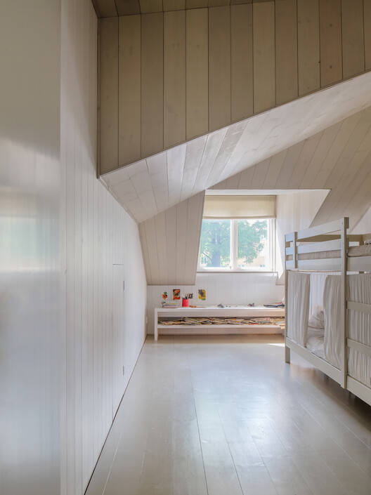 屋顶板状况不佳,正在用现有的新折叠屋顶板替换,屋檐和排水沟的高度保持不变。现有的屋顶形状得以保留,在西南部增加了一个新的老虎窗,在东南部增加了屋顶的一个倾斜部分,为阁楼中的卧室提供家具。面对Börjegatan,屋顶保留了现有的外观,下面是房屋的客厅,天花板高度和可见的现有屋顶结构。在邻近房产的后面,放置了一个宽敞的天窗,为楼梯和厨房提供日光;在原本单面的房间里,这是一种意想不到的品质。厨房油烟机和壁炉的新烟囱以新的角度连接到屋顶部分。恢复了原始楼层,这意味着房间恢复了更多的原始特征、比例和房间高度。一排新的内部门道创造了令人愉悦的房间连接和视线,从建筑创建之初就有了一种触感。