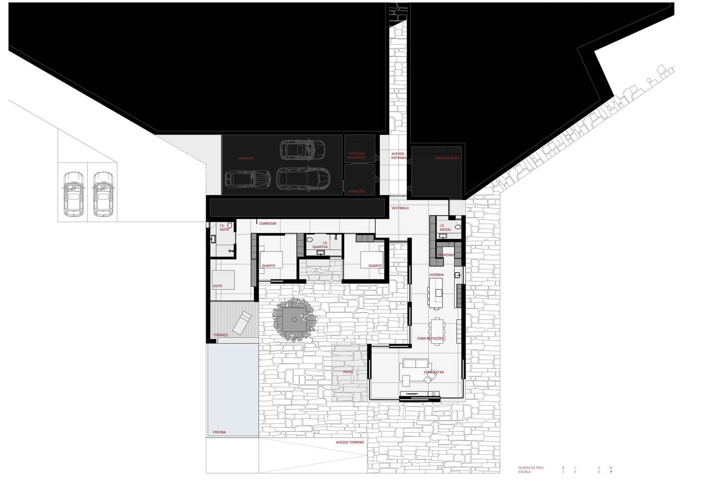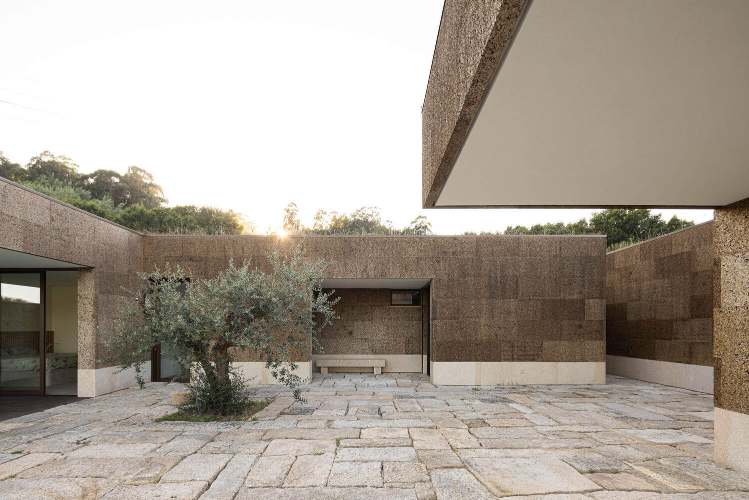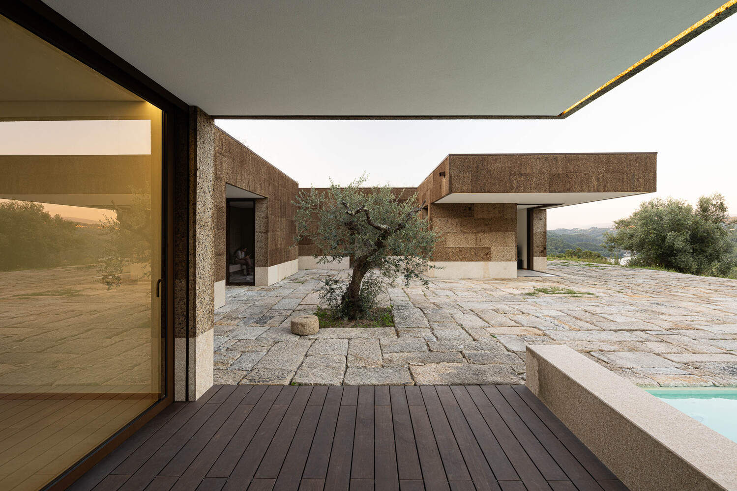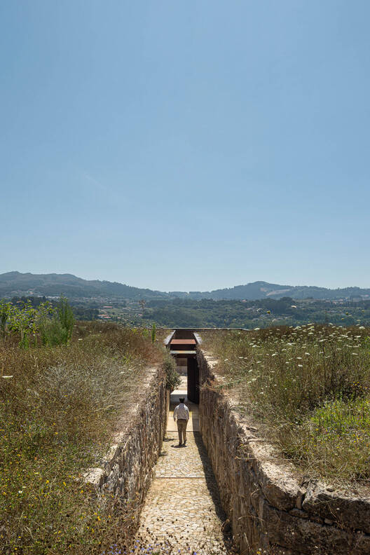 Sustainability - The technical and construction choices follow the idea of integrating the house into the landscape, improving energy efficiency and the durability of the building alongside a commitment to environmental preservation and sustainability. Examples of this include the use of cork panels as the exterior cladding of the house, a landscaped roof (continuing with the terrain), and the stone patio constructed with the integration of stone from the ruins, whose stereotomy design was based on the reuse of the granite stones.
