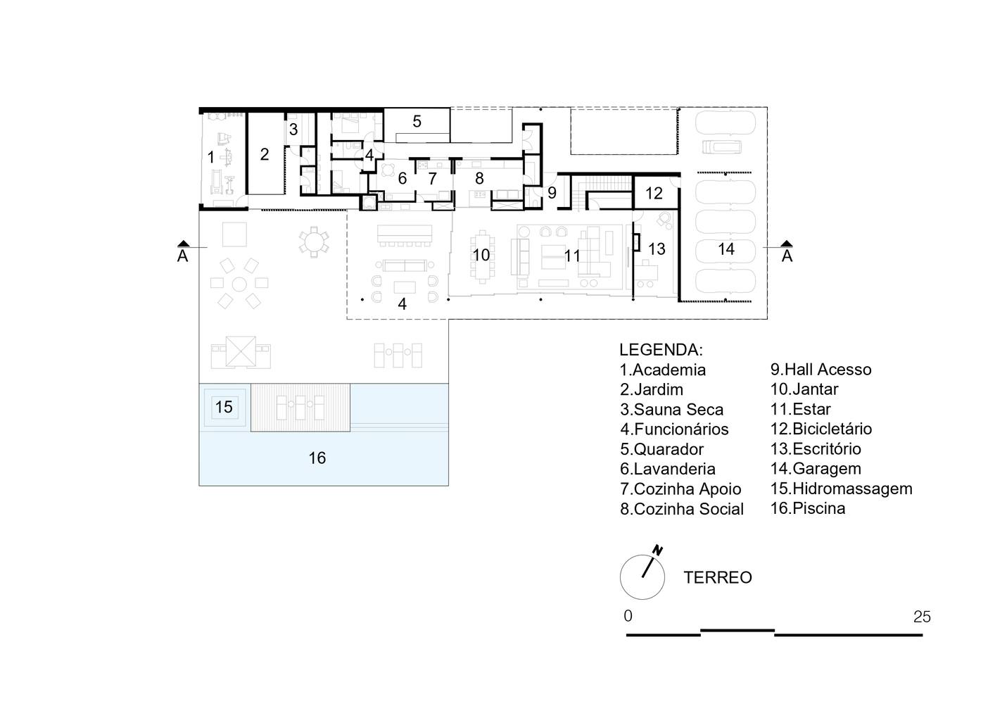 除了灌木和树木,地面花园还设有一个宽敞的游泳池,与包括餐厅、客厅和办公室在内的社交区域融为一体。大型玻璃面板可以完全打开外部,创造出一个宽敞的阳台,其特点是视觉渗透性和空间之间的和谐。为了保护功能区,透明度让位于包围厨房和洗衣房的混凝土墙,以及支撑游泳池区域的健身房、桑拿浴室和更衣室。一楼可通往由六间套房组成的私人宿舍。其中五个横向放置,通过深灰色铝制遮阳板接收过滤后的阳光,并提供与地块侧面相接的景色。主卧套房位于楼层尽头,面向花园。它有一个舒适的阳台,可以俯瞰游泳池和房产所在的广阔地平线。室内设计由中性色调和冷静、极简主义的饰面组成,家具突出了巴西著名设计师豪尔赫·扎尔苏平、塞尔吉奥·罗德里格斯、贾德尔·阿尔梅达和卡洛斯·莫塔的作品。