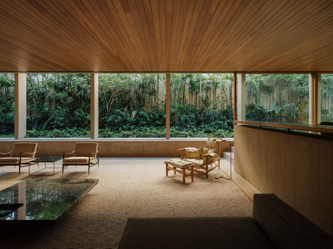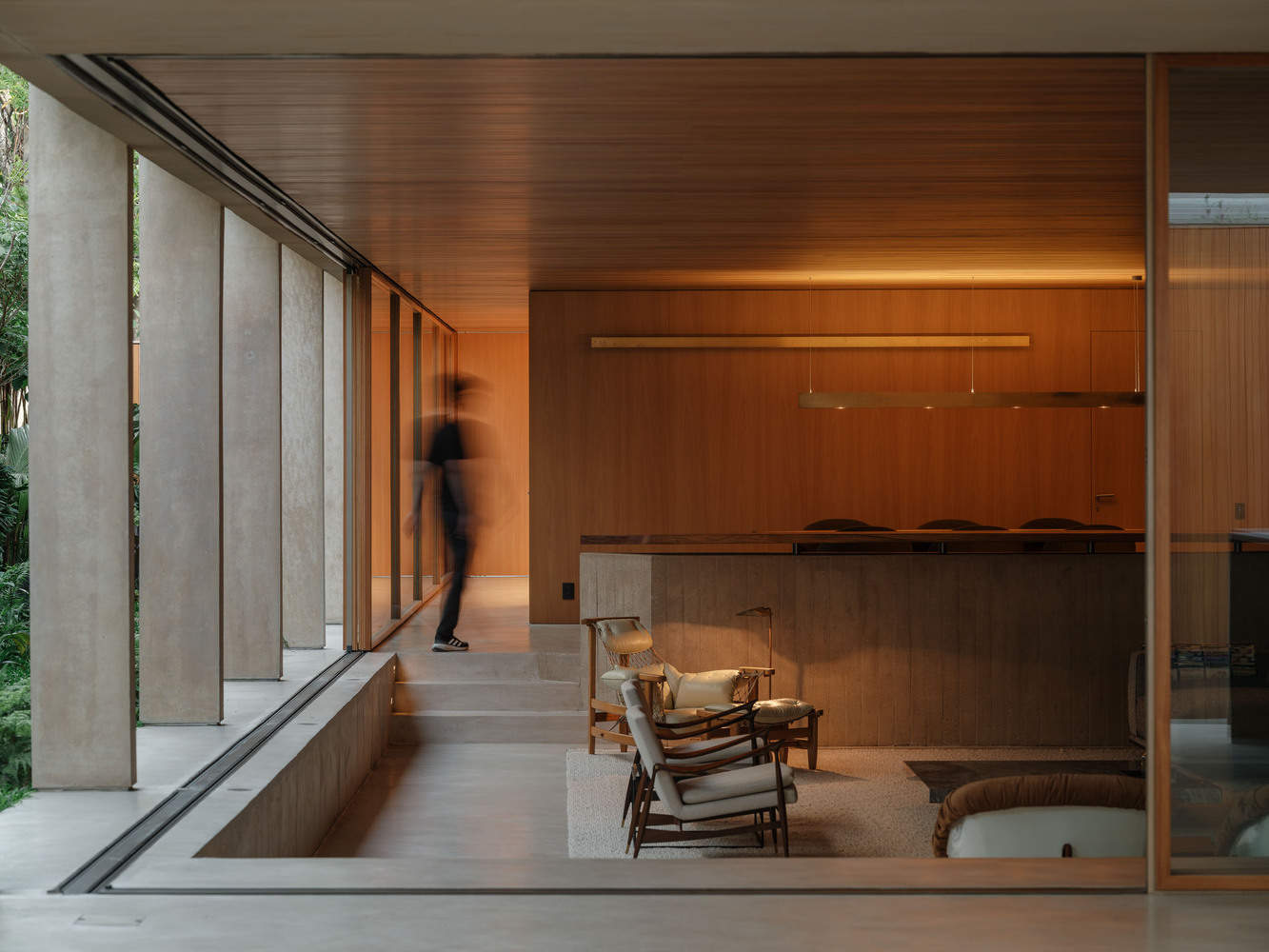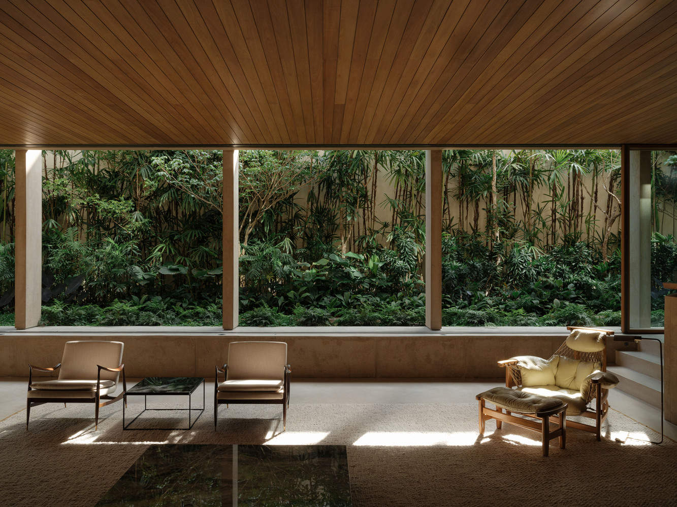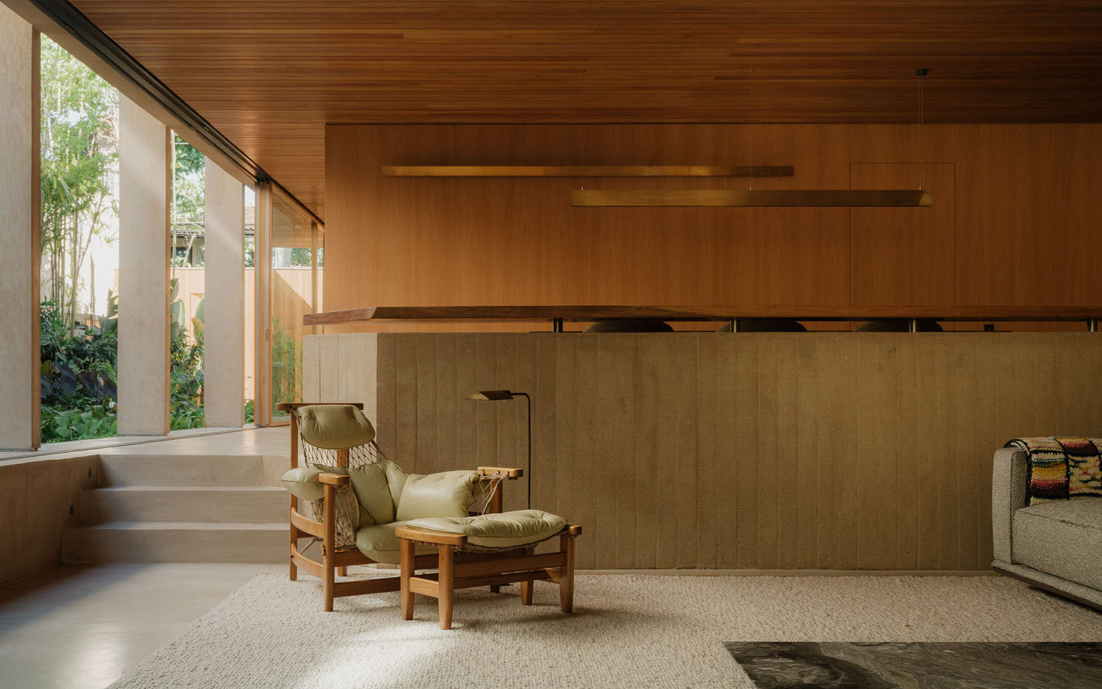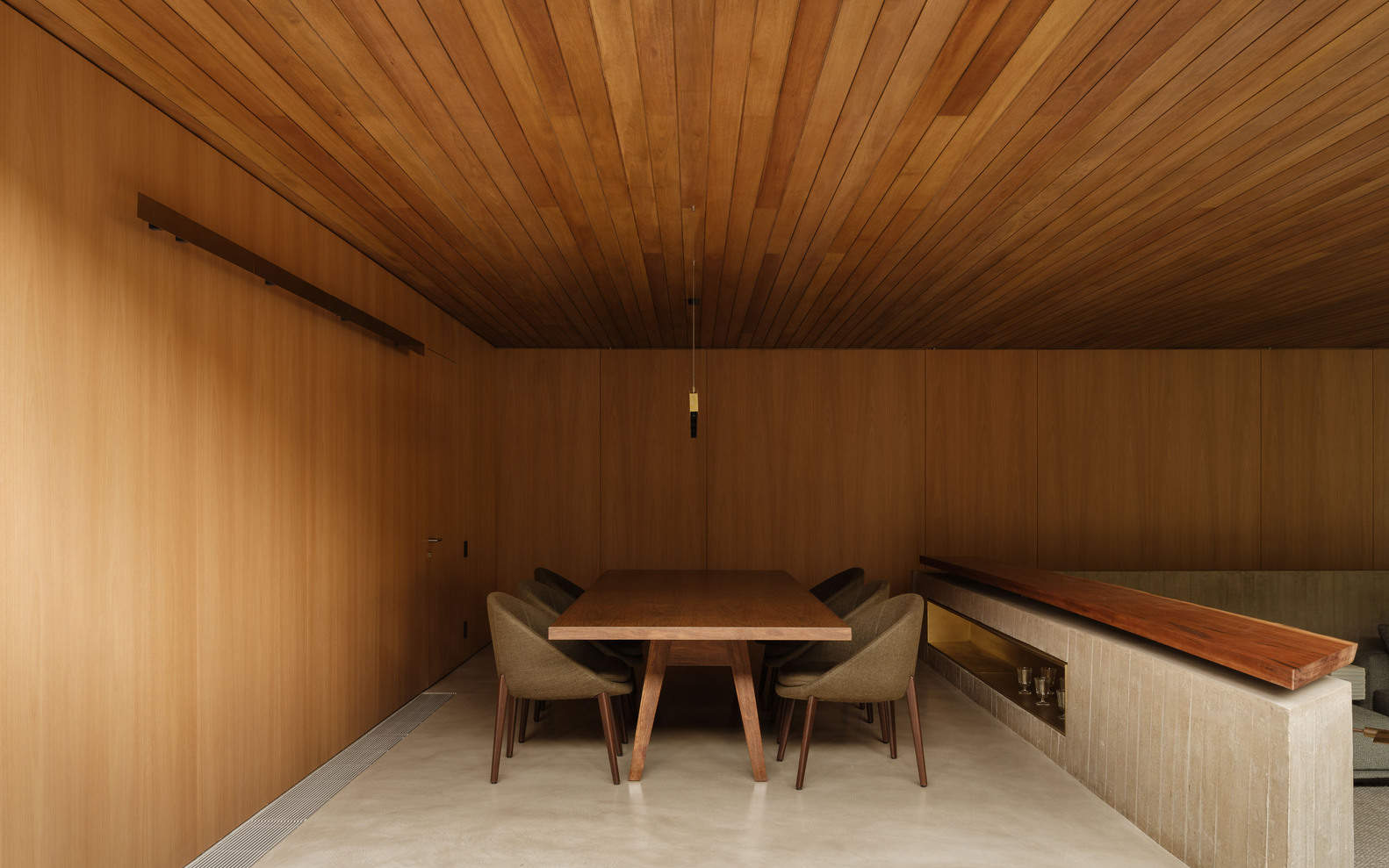 The Wooden Ceiling - Architects often establish design premises in their projects. For this house, the most complex one was undoubtedly maintaining the wooden ceiling in the living room completely uniform — without visual noise, perforations, light fixtures, or air conditioning vents. Besides creating a unique atmosphere, this approach encourages indirect, reflected lighting, which is always more pleasant and cozy. Air is supplied through the floor and returned via a discreet gap along the window frame. The living room becomes a pure wooden box inserted within a concrete grid.