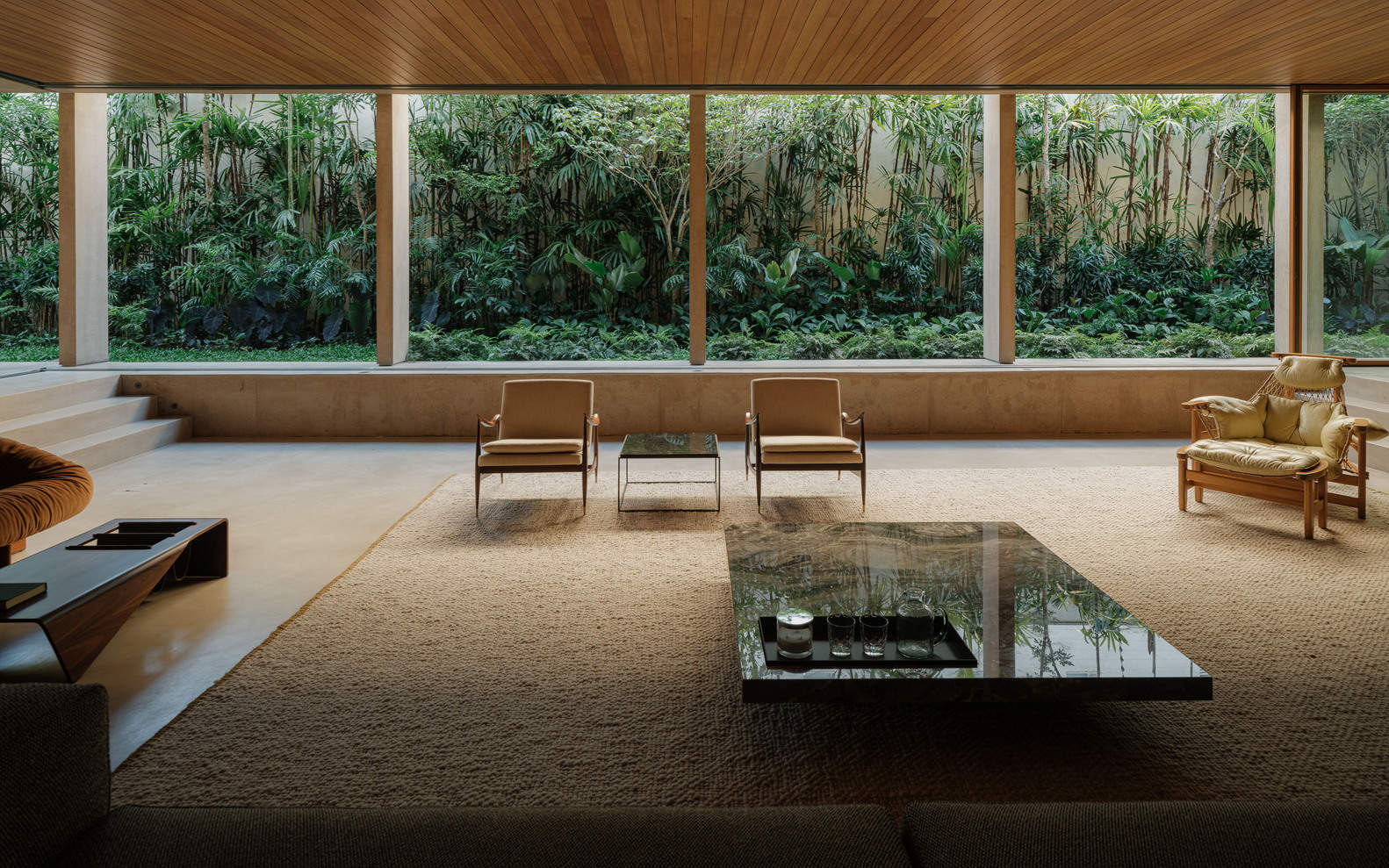 A Garden of Trees and Stones - The living room fully faces the garden (created by the landscape designer Rodrigo Oliveira) where raw heavy stones carve paths through the tropical vegetation. Viewed from the social area, the greenery appears to be projected inward, creating an introspective, contemplative experience. The concrete structure establishes a relationship of both tension and harmony with the garden. We conceived it as a controlled enclosure around the house, an architectural promenade that enables carefully curated perspectives.