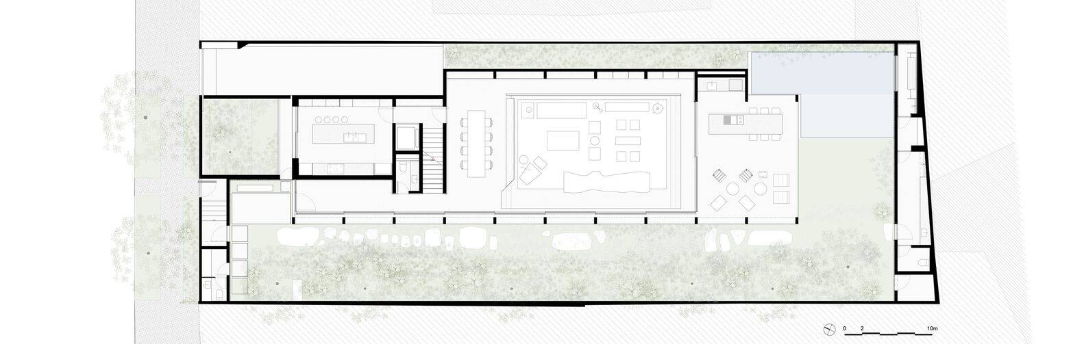 Text description provided by the architects. Architecture Seen from Nodal Points - Upon entering the 42-meter-deep and 15-meter-wide plot, the garden unfolds at the front, while the house stands to the left, parallel to the 5-meters-setback. This first view of the house was designed as a nodal point for spatial perception. From there, the journey through the house is structured as a sequence of framed views that emphasize the space’s frontality and depth, minimizing diagonal perspectives.