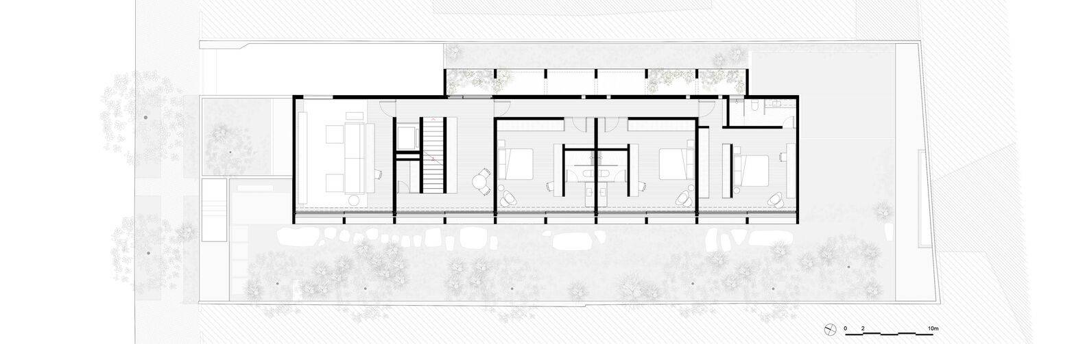 多一层楼——在双层垂直混凝土网格之上,增加了一层楼。我们计算了视线,以确保从花园里看不到这个体积。其目的是保持立面的水平感,不受这一最终层次的干扰,这是为了满足客户的程序需求。一个换位