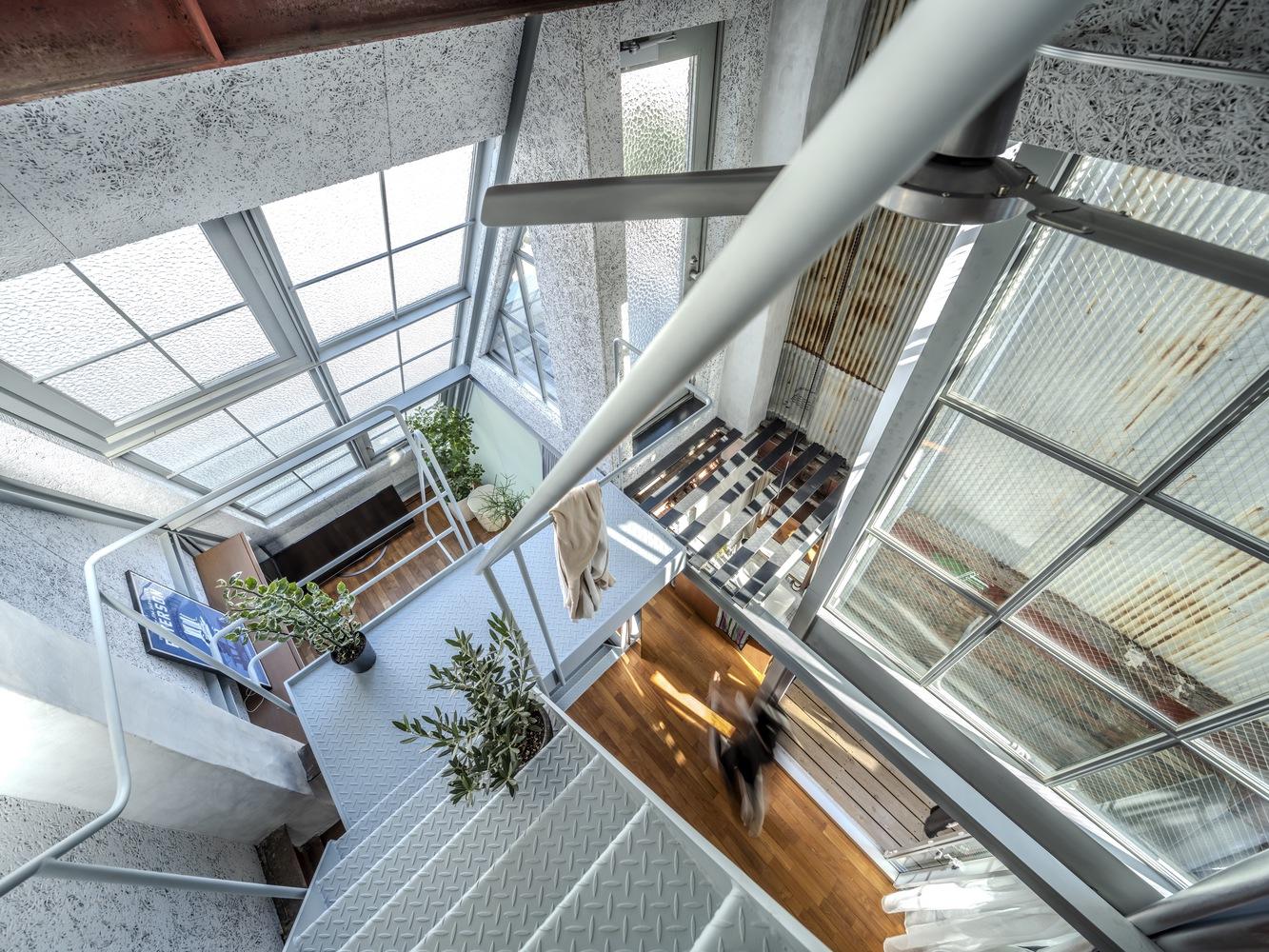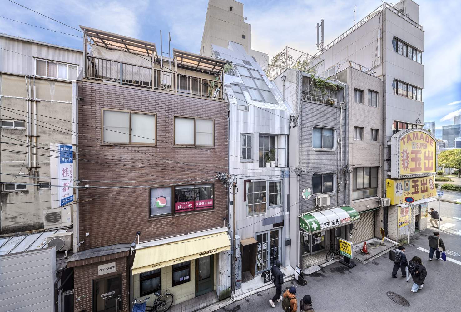 We designed the home of a person who had lived in such a town for many years to be renovated into a house with a store. We renovated everything about the nearly 50-year-old building except for the foundation, steel frame, and the east and west exterior walls, which are semi-integrated with the houses on both sides.Although the site is in a highly convenient location, it is only a little less than 30 square meters in area. It was originally a five-story building, but in order to eliminate the cramped space and reduce the burden associated with legal regulations, the second and third floors were made into two-story atriums, making it a three-story building. However, we created a terrace between the floors that can be used for maintenance, making it look like a five-story building.