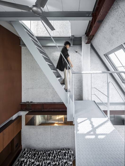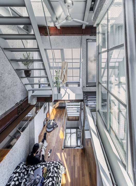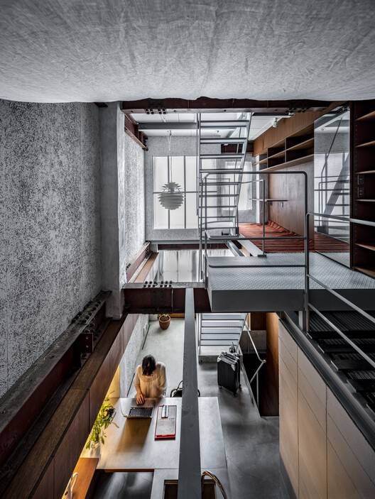 空间布局的亮点:项目最引人注目的特点之一是其对垂直空间的巧妙利用。考虑到楼梯作为生活空间的一部分,设计师将其置于住宅楼层中央,创造了灵活的流通路径。通过中庭和楼梯的连接,整个建筑呈现出一种松散的连贯性,同时兼顾了不同楼层的隐私需求。特别是,通过将二、三层改造成中庭,并设计可用于维护的露台,巧妙地在有限的空间内实现了多层建筑的视觉效果。这种设计策略不仅提升了空间感,也为建筑带来了多重可能性,如二楼的出租,进一步模糊了空间边界,增强了居民、商店与城镇之间的互动。