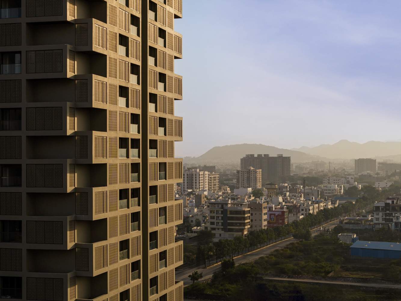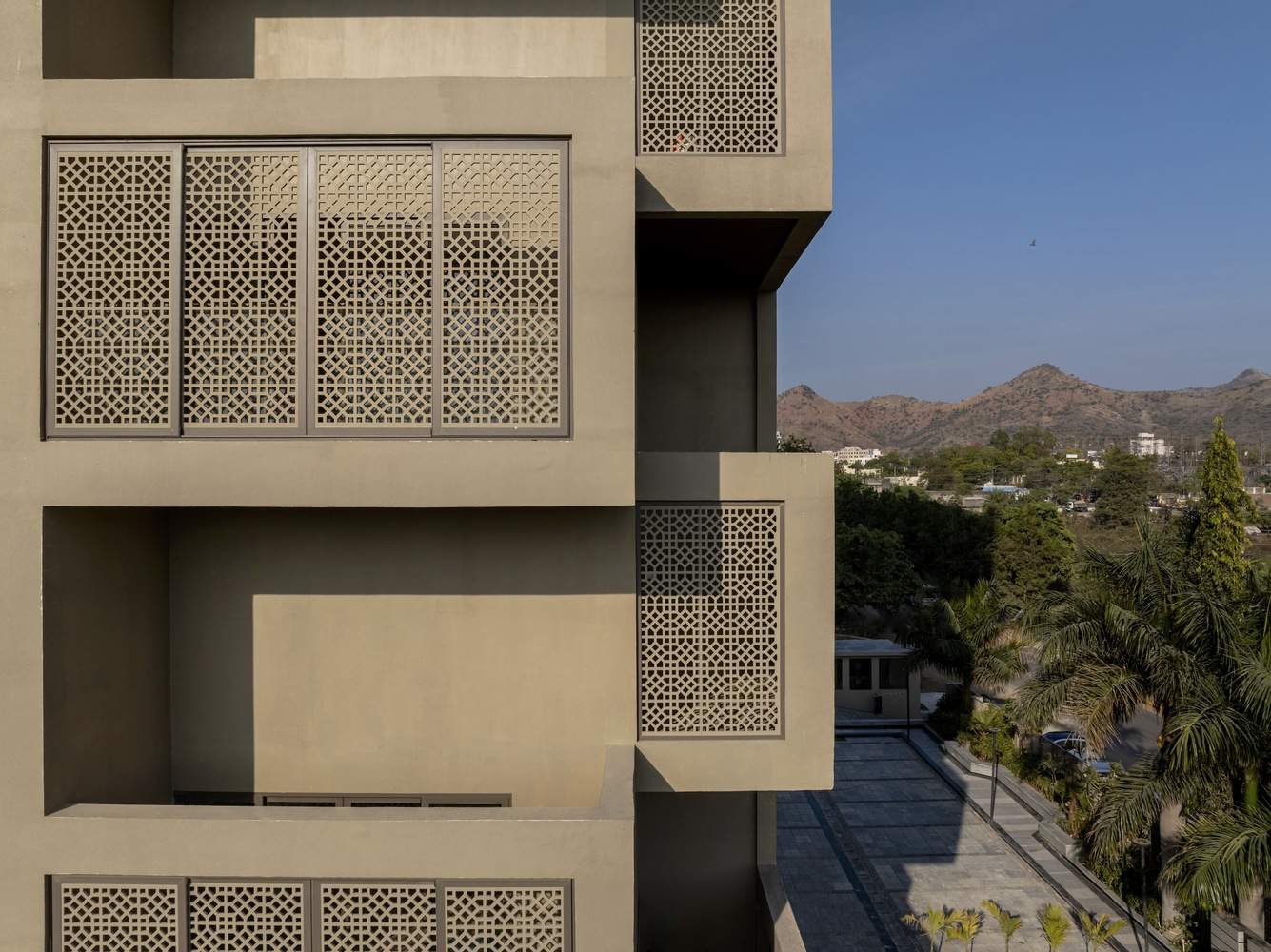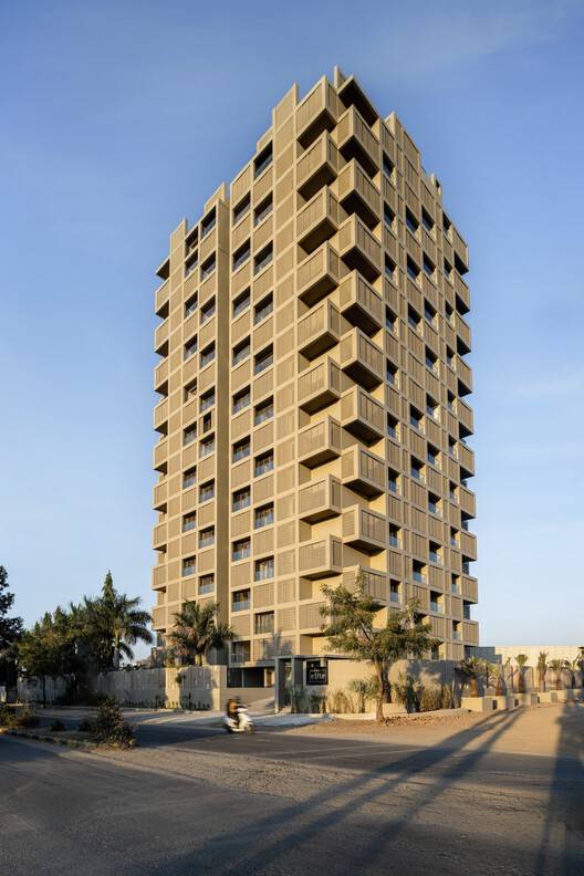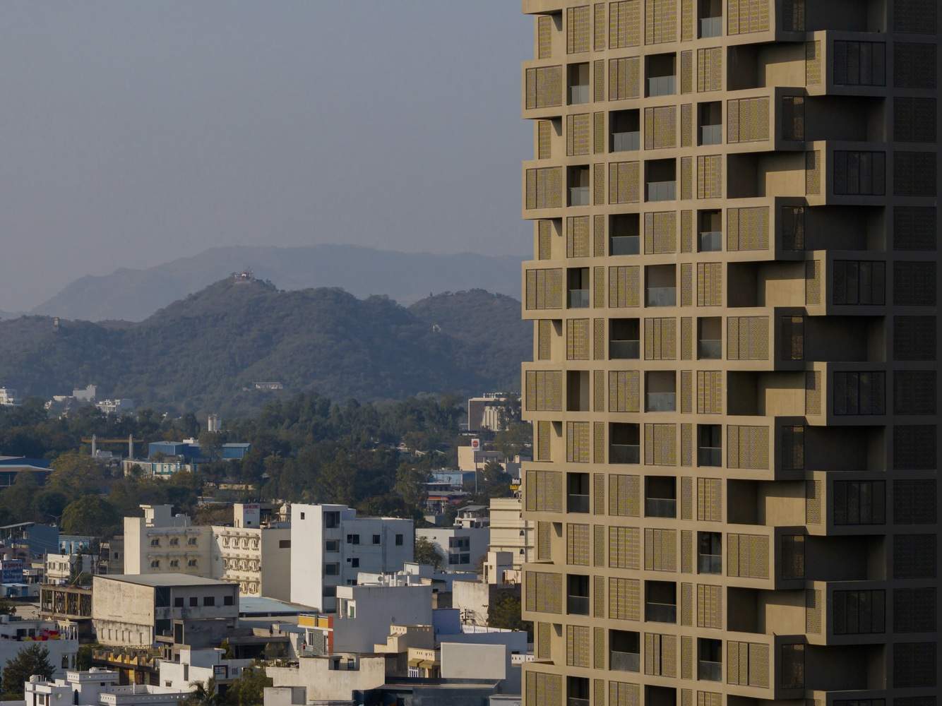 Text description provided by the architects. Screen 504 is a 21-storeyed apartment building with 78 apartments on a site of 3690 sqm located in Udaipur, Rajasthan, India, with a total constructed area of 20,000 sqm. At every level, four apartments, each with four bedrooms & living spaces, are planned in each quadrant to allow visibility & views of 2 adjacent sides of the surroundings with hills in the distance in all directions. Traditional architecture in the region dating back to the 16th & 17th centuries has multiple examples of projected screened balcony spaces to combat the excessive heat of the summer months which can vary from 35° to 48°C, providing privacy simultaneously.