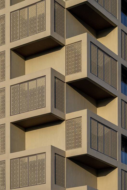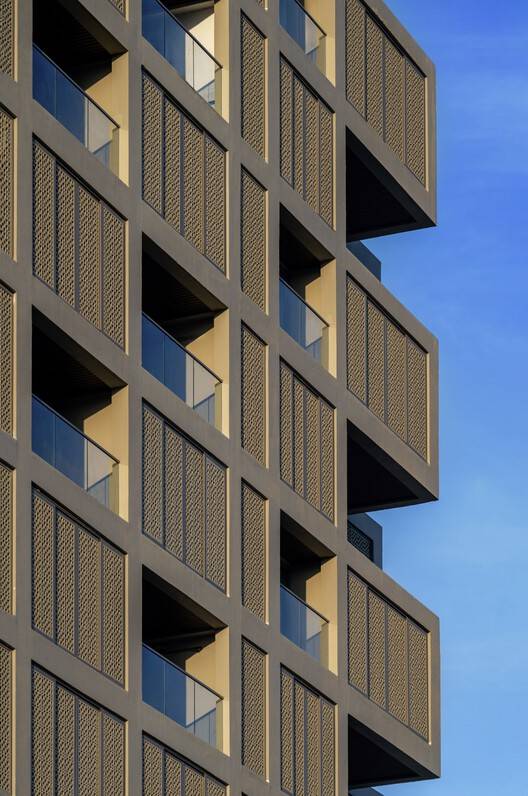 设计概念与地域文化的融合:“SCREEN 504”住宅楼最令人印象深刻的亮点在于其对地域文化的深刻理解与巧妙运用。项目灵感来源于当地传统建筑中对阳台和遮蔽空间的运用,这种设计策略并非简单的复制,而是将其精髓融入到现代建筑中。通过设置可调节的屏风甲板和开放式阳台,项目不仅有效应对了当地炎热的气候,降低了热量侵入,同时也在室内外之间创造了过渡空间,丰富了居住体验。这种设计手法体现了建筑师对地方文脉的尊重,以及对可持续设计的积极实践。