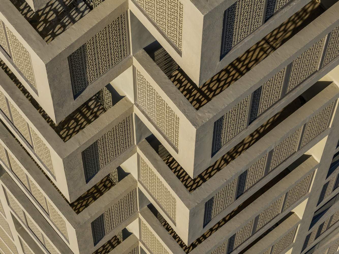 Each apartment has 5 balcony spaces fronting the living room & the 4 bedrooms.Some of these are open and some are screened with sliding screens that are perforated with a traditional pattern. The screened decks can be opened up partially. One of the decks in each apartment is 20 feet high. The residents have the option of using single-height 10-foot-high decks or 20-foot-high decks which can be completely open, partially open, or completely screened depending on the weather.