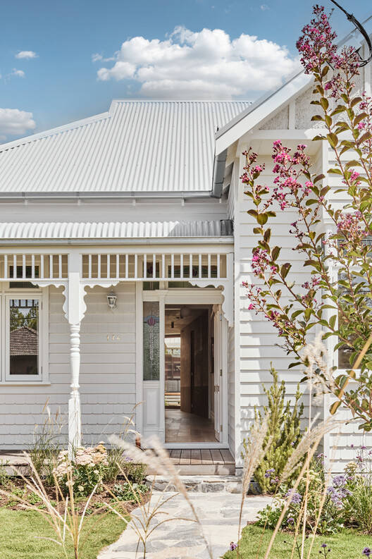 At the front of the site, the heritage portion of the home has been meticulously restored to its former glory, preserving its architectural character while seamlessly integrating a new functional program. This part of the home accommodates three bedrooms, a bathroom, an ensuite, a laundry, a mudroom, and a powder room, ensuring a balance between tradition and contemporary living. The restoration extends beyond preservation, blending the vernacular of the existing pitched rooflines with a contemporary interpretation in the rear addition, creating a cohesive yet distinct dialogue between old and new.