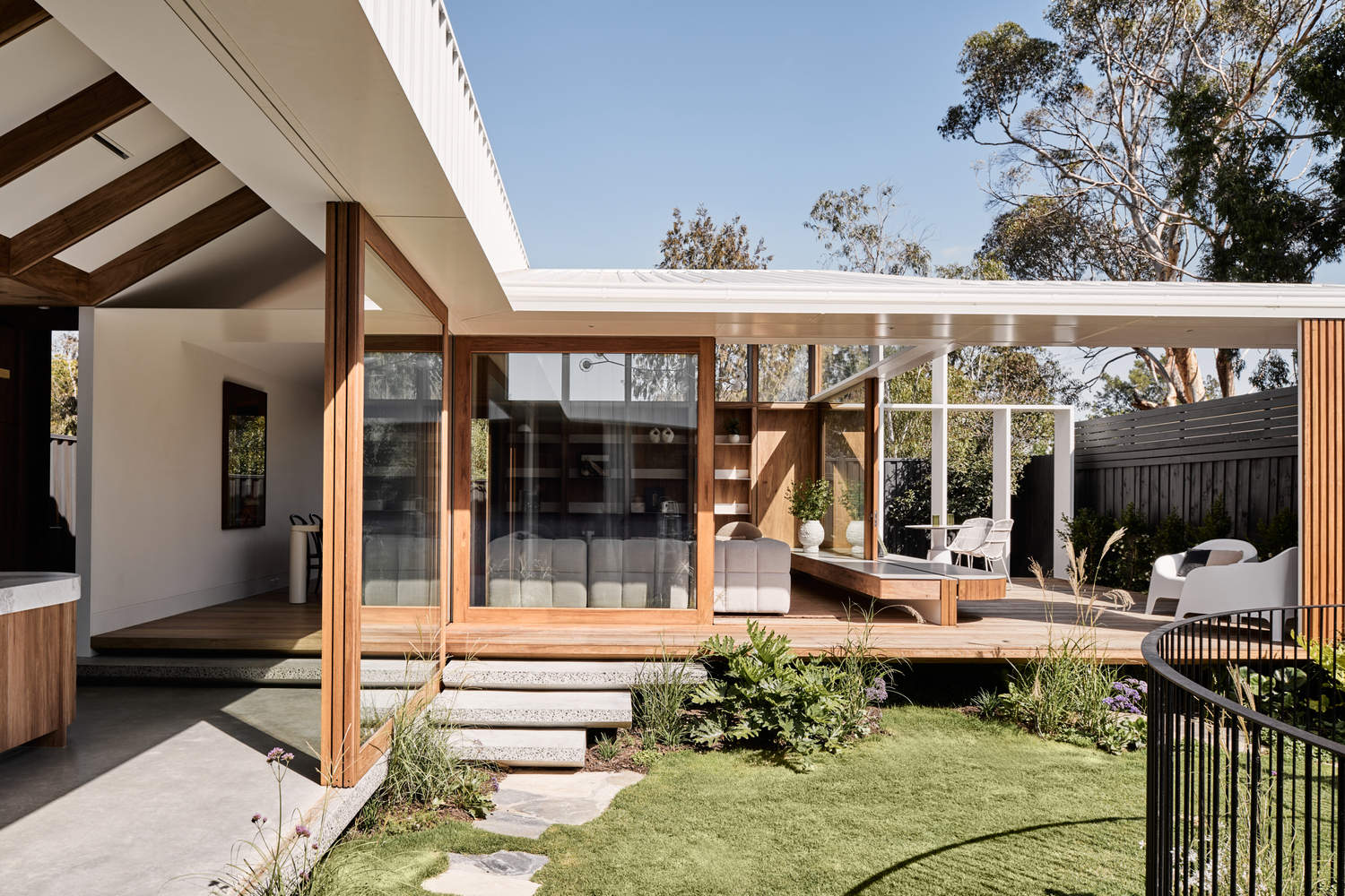 The elevated rear deck extends the living and alfresco areas, seemingly floating above the landscape, stretching the elevation of the building while forming a sculpted edge—both a seat and a threshold that frames the courtyard as its own realm.