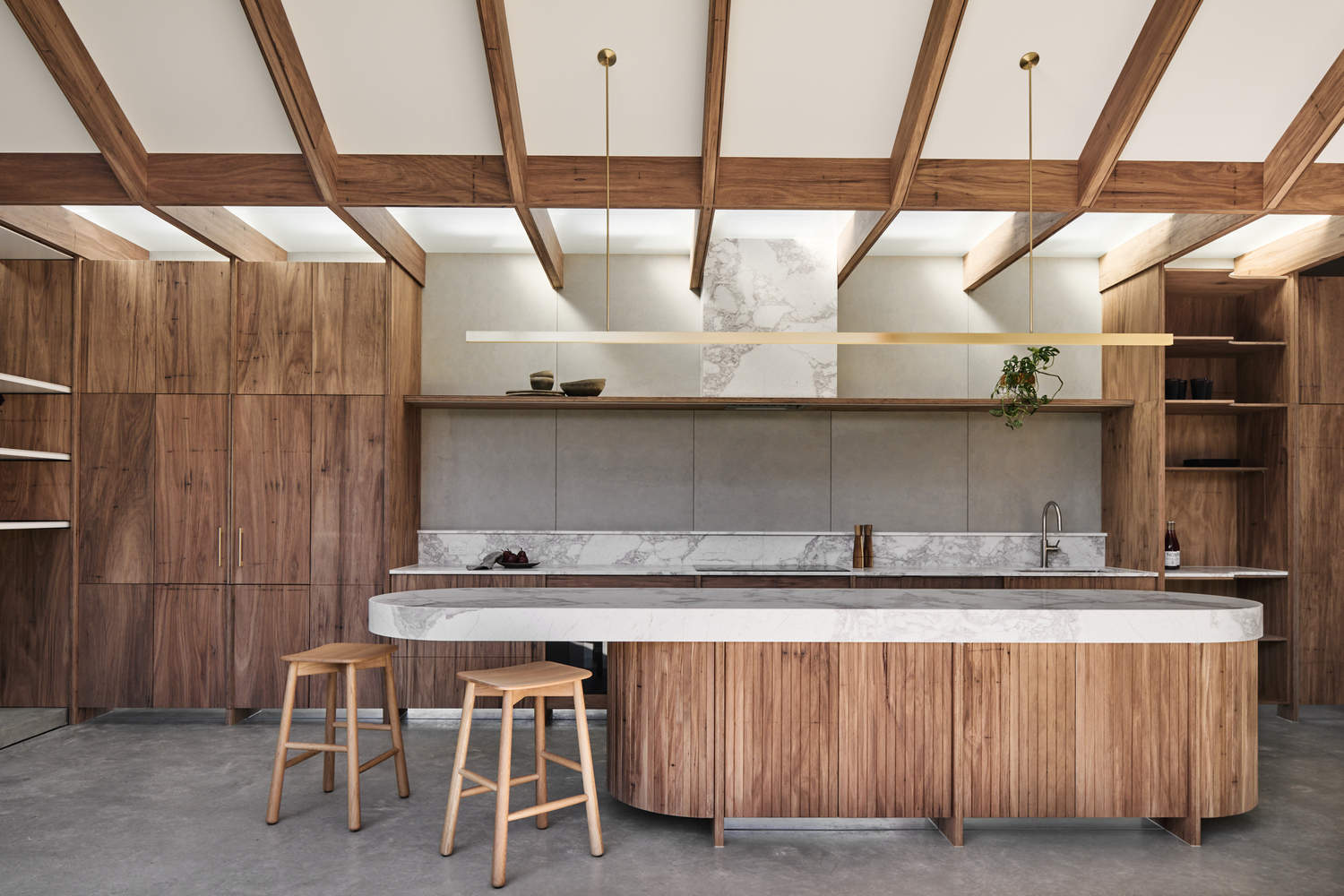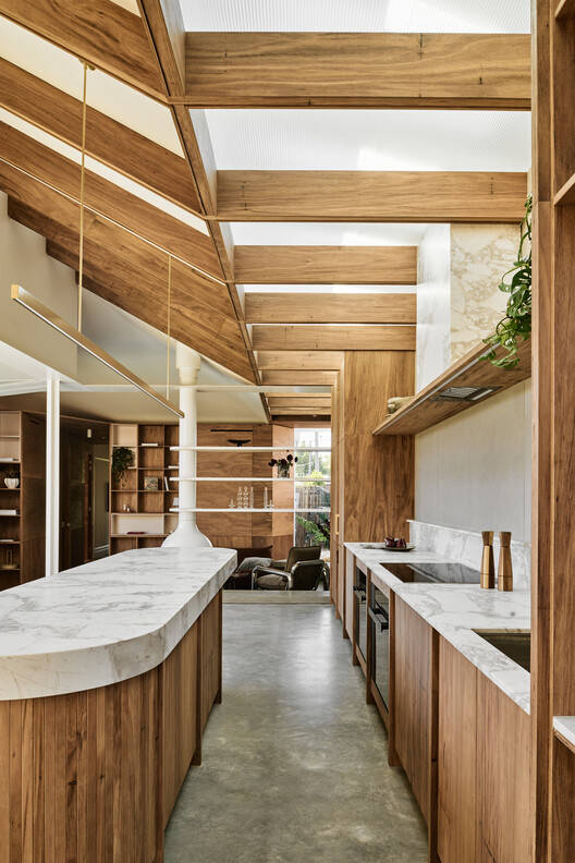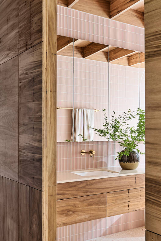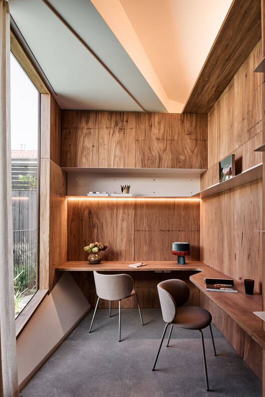 Materiality plays a vital role in grounding the house within its context. The solidity of concrete floors is softened by accents of hardwood blackbutt plywood, which is expressed in the vaulted ceiling beams, bespoke joinery, and the threshold tunnel that mediates between old and new. This interplay of textures enhances the warmth and tactility of the spaces.