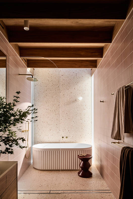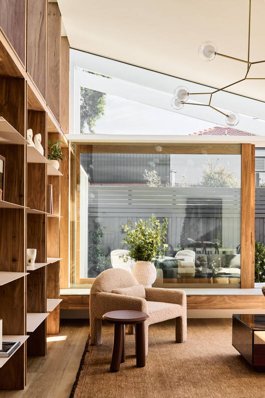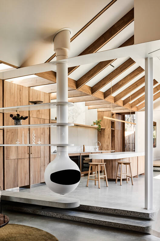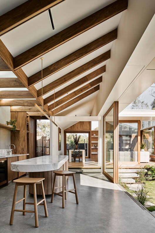 这所房子的选址经过了仔细考虑,以创造一种真正远离郊区环境的感觉。南部边界的邻近住宅通过庭院的位置谨慎地隐藏起来,加强了隐私,同时最大限度地欣赏了远处高耸的桉树树冠。在生活空间内,高高的窗户将树梢框起来,过滤光线,同时遮挡周边围栏的景色,营造出一个既封闭又与自然紧密相连的世界。Hug House的核心是FIGR建筑哲学的表达——一种重视流动性、材料诚实性以及建筑形式与景观之间亲密对话的建筑哲学。