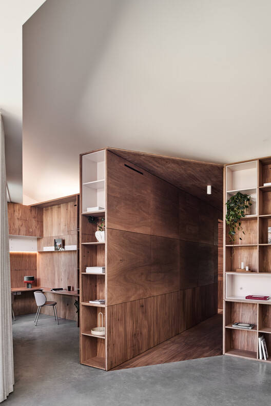 物质性在房子的背景下起着至关重要的作用。硬木黑杨木胶合板的色调软化了混凝土地板的坚固性,这在拱形天花板梁、定制细木工制品和新旧之间的门槛隧道中得到了体现。这种纹理的相互作用增强了空间的温暖和触感。