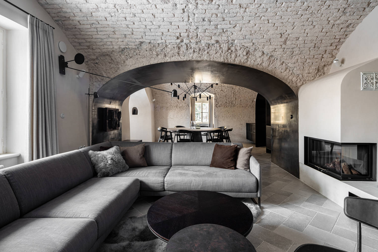 However, the whole house is not only made in the traditional spirit. Contemporary technology, such as underfloor heating with a heat pump and recuperation, was sensitively installed throughout the interior. In addition, the heating is complemented by a fireplace insert in the living room. The interior, as such, is done in a contemporary spirit. The exposed stonework is painted in gray tones, and the passages through the powerful load-bearing walls are framed by a thin cladding of raw waxed steel. The floors on the ground floor are in tiles of a smaller format, folded "dovetail". The dining room is dominated by a large circular dining table with engraved coordinates that record important life moments for clients. A dominant multi-armed chandelier is placed above the dining table. The kitchen space with vaults gave rise to an atypical kitchen unit that respects the arches of the vaults and at the same time has everything you need. The furniture, like all built-in furniture in the house, is completely ventilated. The central island is made of solid wood with a stainless steel worktop, and the other parts of the furniture have steel doors.