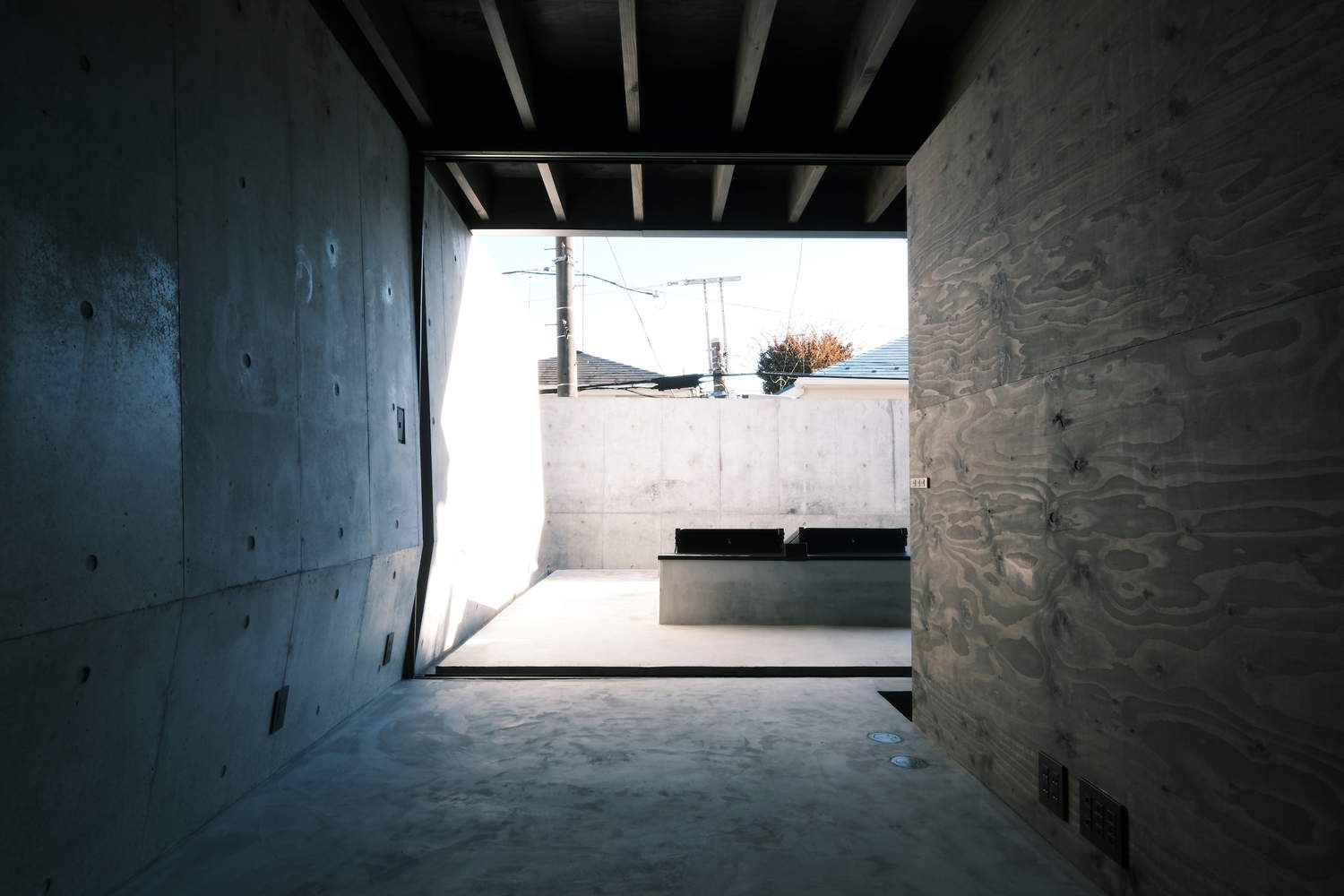 A wooden flat roof rests on the northern walls, forming both the interior space and a terrace-like area. The living room and kitchen are sunken 40 cm below platform level, with darkened wood flooring reinforcing the sense of depth. This sunken area resembles a ceremonial altar where daily life unfolds in privacy. A staircase in the southwest corner leads to the basement, where the bedrooms, shielded from the street, offer a tranquil, cocoon-like atmosphere with only skylights connecting to the sky.