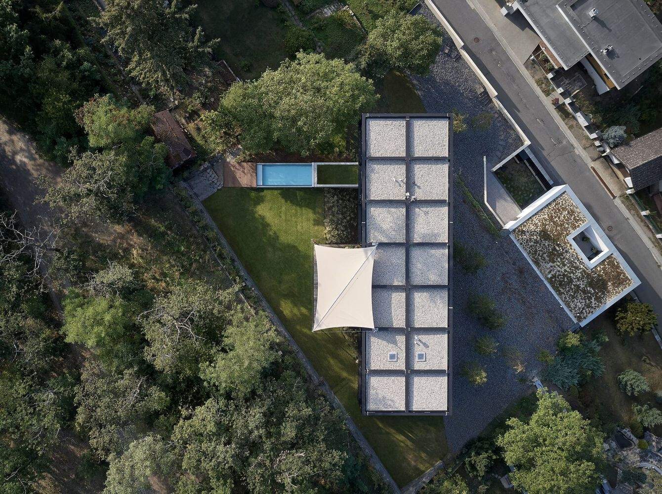 Close collaboration with the landscape architect Vladimír Sitta led to the idea of a slate slope with birch trees – a novel solution that is in harmony with the building's overall architectural design. Some of the design aspects, such as the pool and related elements, were the result of this joint effort between the architect and landscape designer. The house is the essence of a unique creative process, which involves not only architects but also a large team of specialists in the design and production of individual parts of the building. The owner of the house also occupies an exceptional position, whose involvement in the entire process of preparation and construction significantly influenced the overall result.