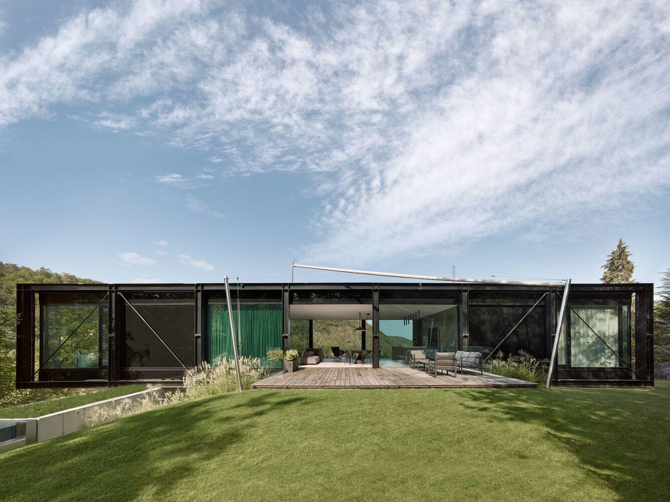 他们的计划以悬挂房屋的概念为基础,在应对这些挑战的同时消除了这些缺点,并最大限度地发挥了房产的优点。获胜的形式是柱子上的桥状结构。因此,这座建筑就像一座放置在陡坡上的钢制人行天桥,在那里它被转向以面对最好的北方景色和南方的阳光。预制钢结构由一个由HEB 300型材制成的外部承重部分和一个主要由IPE 160型材组成的内部结构填充物组成,前者桥接了单片钢筋混凝土柱之间的18米距离,后者用作窗户、屋顶和地板的承重框架。这座建筑是一个结构、建筑和技术实验。既没有空间,也没有用传统方法设计房子的愿望;相反,我们的目标是找到突破极限的解决方案,测试市场上最新的技术产品和设备,例如瑞士空气勒克斯窗户,带有专利的空气辅助密封件,以及带热泵的供暖和制冷系统,以确保在储热能力低的房子里全年都有舒适的室内气候。