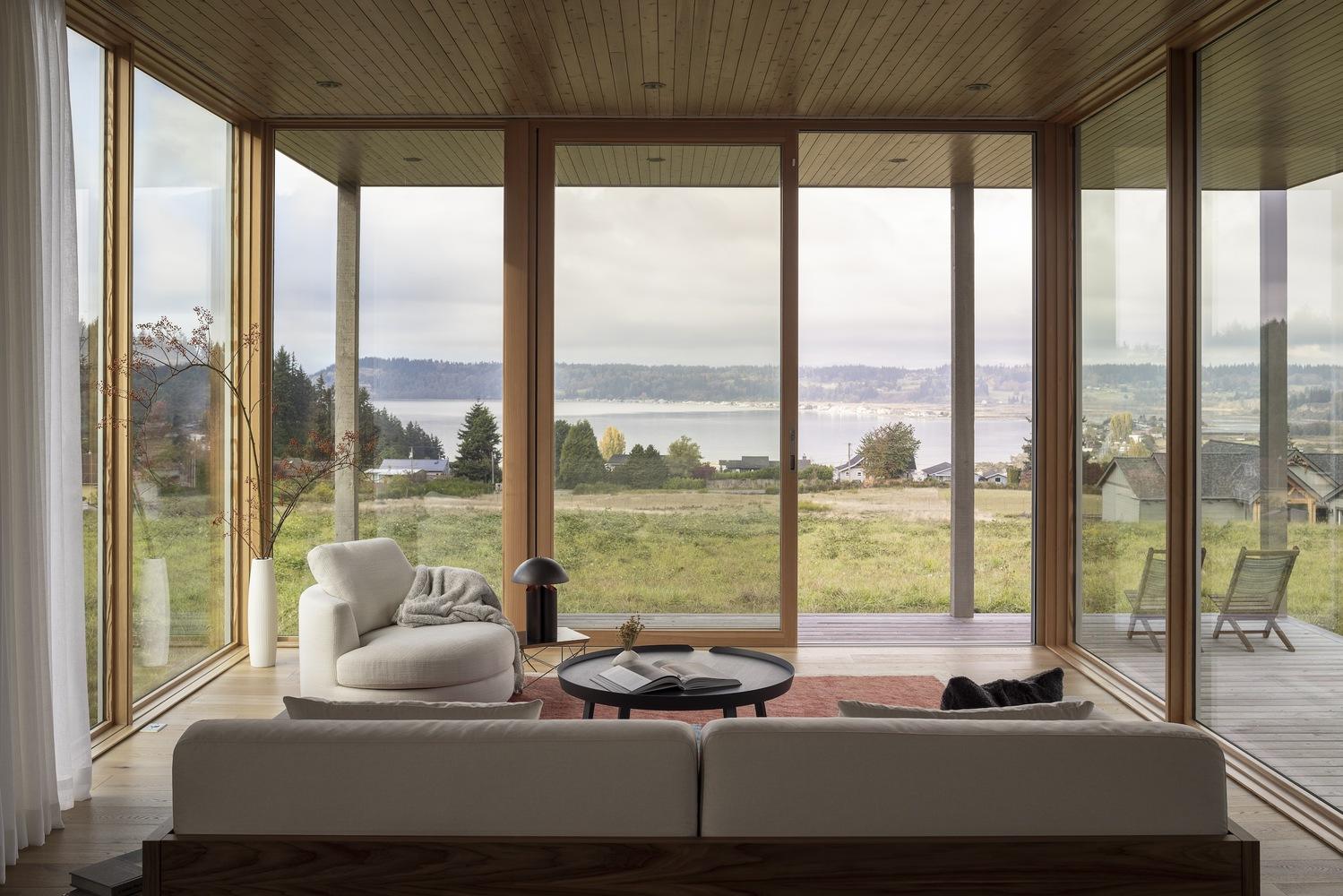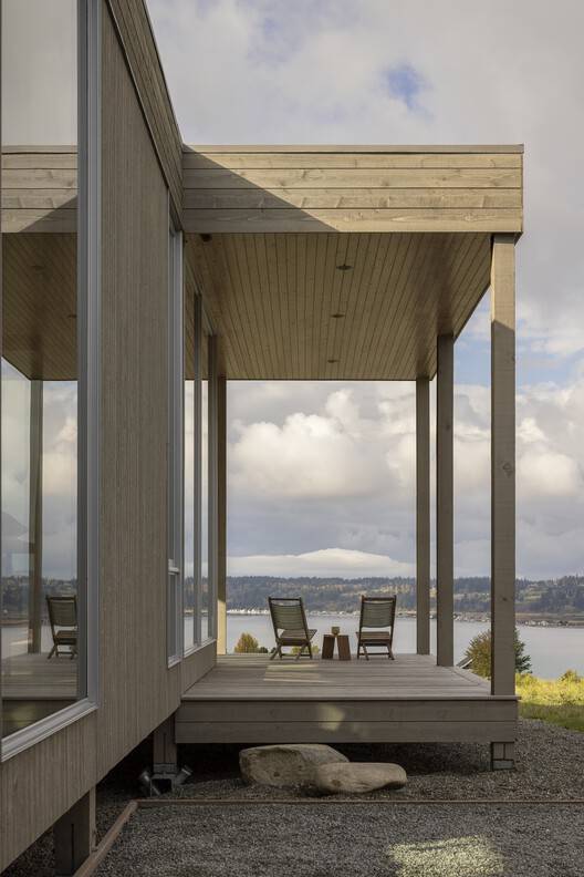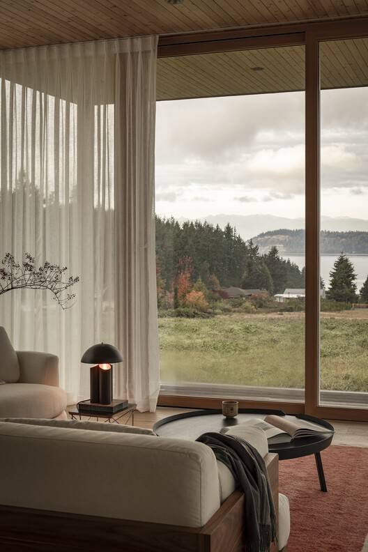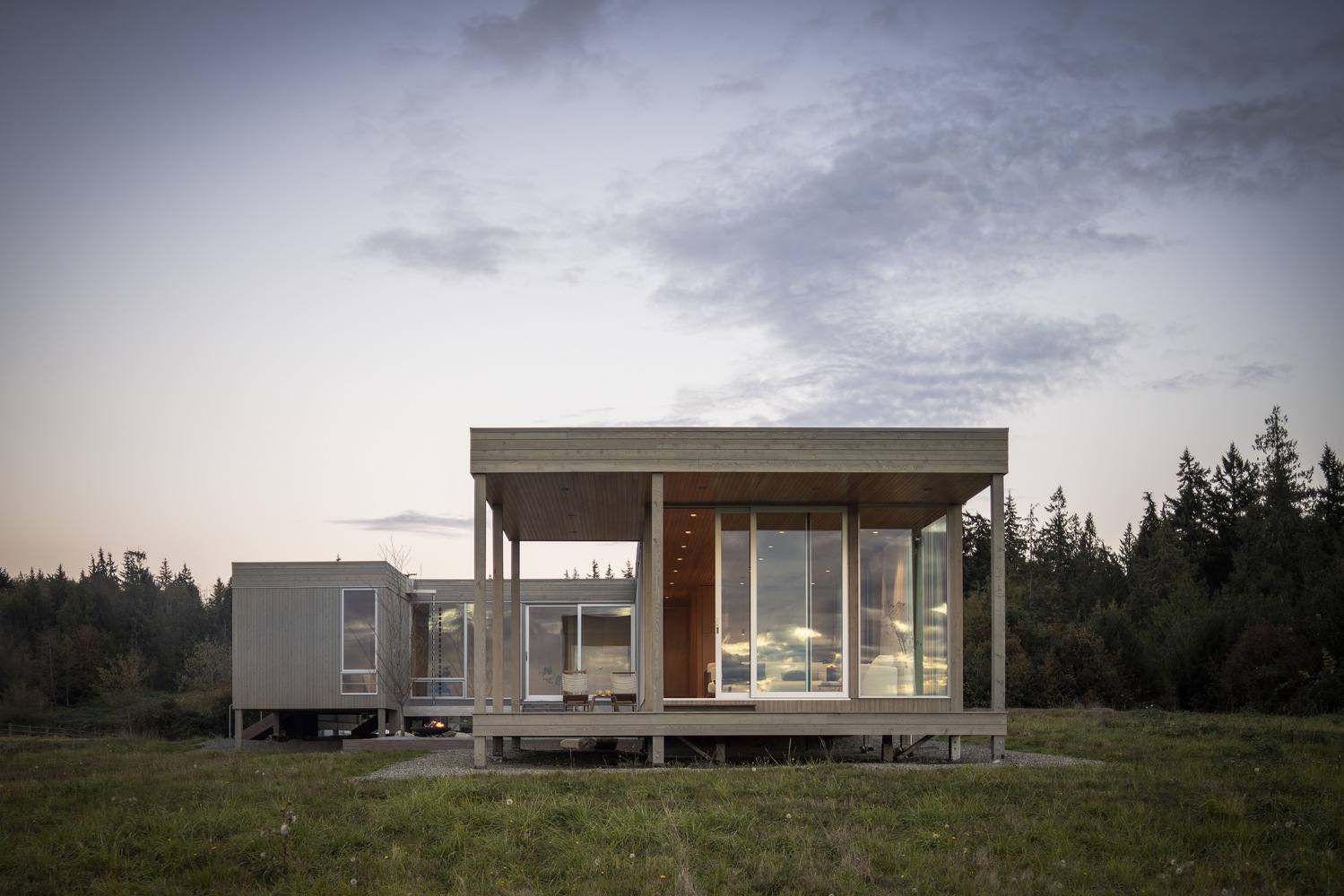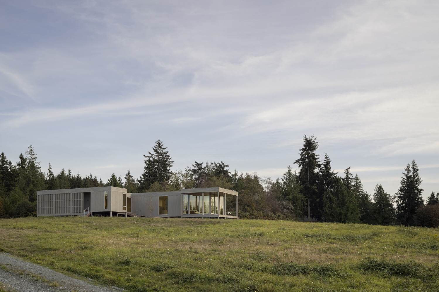 The house consists of two bedrooms, two bathrooms, a multi-purpose room, and a living room and kitchen for communal activities. The transparency of the house invites residents to spend time together and enjoy the rural background, while the house's location on the highest part of the lot allows for panoramic views of surrounding Useless Bay and the Olympic Mountains. During the warmer seasons, the owners can also enjoy a generous west facing deck.