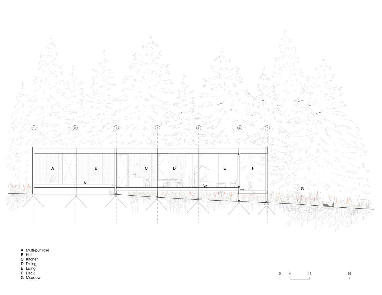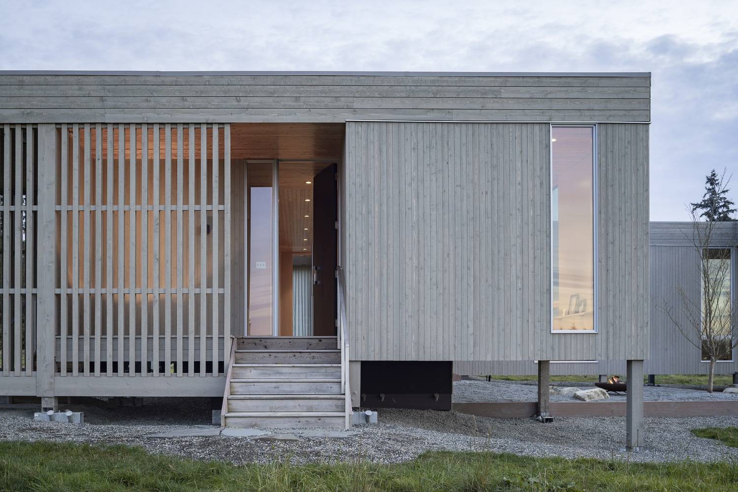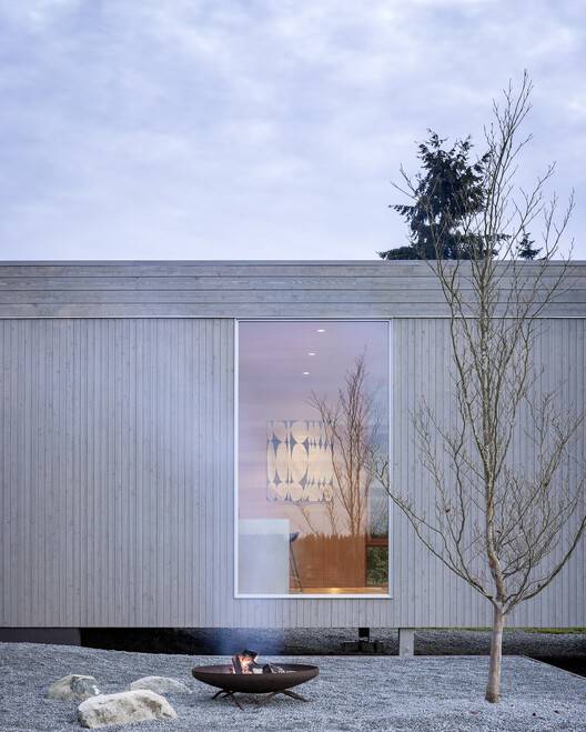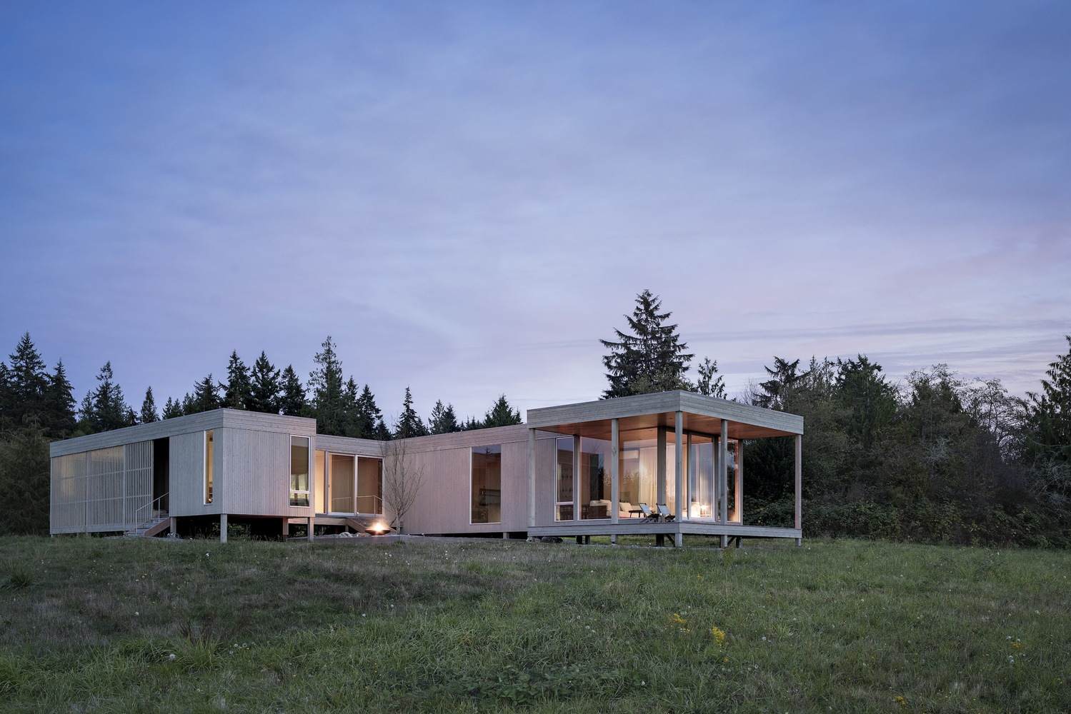 The house consists of two bedrooms, two bathrooms, a multi-purpose room, and a living room and kitchen for communal activities. The transparency of the house invites residents to spend time together and enjoy the rural background, while the house's location on the highest part of the lot allows for panoramic views of surrounding Useless Bay and the Olympic Mountains. During the warmer seasons, the owners can also enjoy a generous west facing deck.