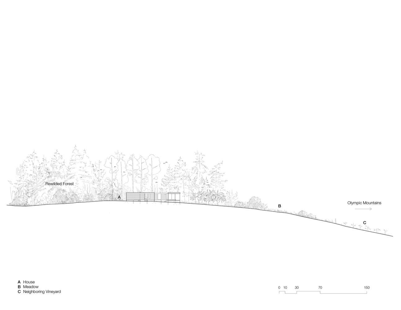 Text description provided by the architects. Floating above a meadow, Whidbey Uparati minimizes visual and physical impact on the natural landscape by blending into the site rather than asserting itself upon it. Upon approach, the meadow vegetation surrounds a winding path up a steady slope to the house. The house is a family retreat for meditation, bonding, and uparati – "stillness" in sanskrit.