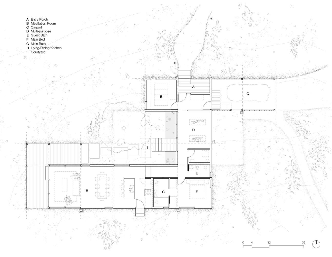 这座1880平方英尺的房子坐落在自然环境之上。草地上长满了青草,环绕着一座低调的雪松覆盖的建筑,窗户宽大,在听觉和视觉上将房子与周围的自然环境连接起来。庭院平面布局围绕着一个破碎的花岗岩露台,露台上有一个反射池、火坑和一棵Stewartia树。主人经常回到印度参加冥想静修。他们请建筑师马特·维特曼设计一个静修所,可以作为逃离城市生活的场所,也可以作为冥想沉思的场所和房屋。
