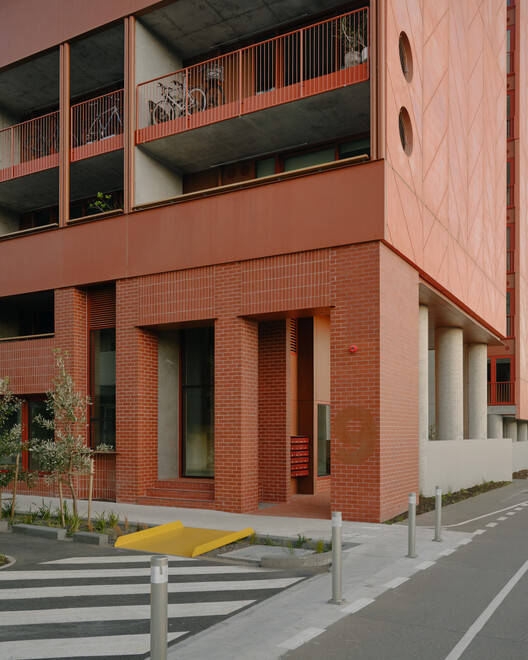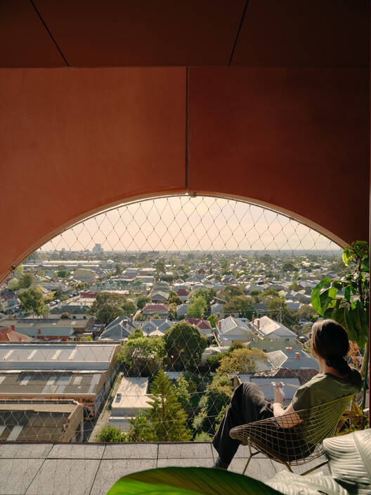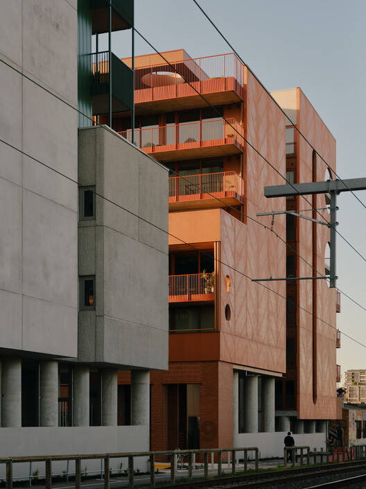 色彩与材质的和谐:在设计语言上,该项目展现了独特的色彩和材料运用。设计师巧妙地运用暖赭色预制混凝土,并以此为基调,构建了橙红色的窗户、门和金属制品,以及赤陶色涂料的FC板,与原始混凝土形成鲜明对比。建筑底部的墙面和地面则采用了19世纪墨尔本常见的红砖,与周围环境和谐相融。特别是西立面的设计,以其超大尺度的视觉构成,赋予了建筑友好的个性,在夕阳的照射下,散发出温暖而迷人的光芒,成为城市景观中一道亮丽的风景线。