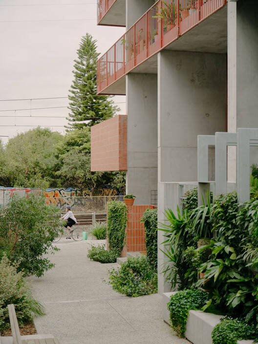 社区与宜居的统一:项目强调了社区的营造,旨在打造一个多元化、有凝聚力且相互联系的居住环境。建筑包含27套公寓,户型多样,从小型工作室到宽敞的两居室,满足了不同人群的需求。更令人赞赏的是,项目在可持续性方面达到了卓越的标准,包括7.5星的NatHERS热评级、100%无化石燃料运行、零私人停车位以及共享汽车。此外,20%的公寓预先分配给经济适用房,优先考虑关键服务工作者、残疾人士及原住民,体现了建筑师对社会责任的担当和对社区建设的关注。