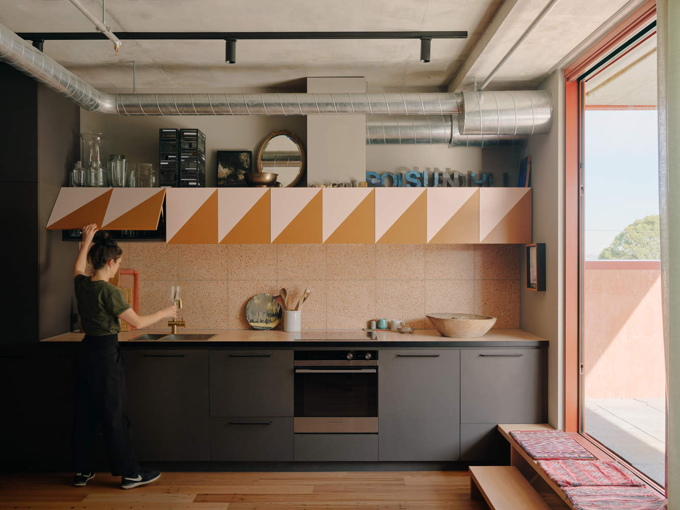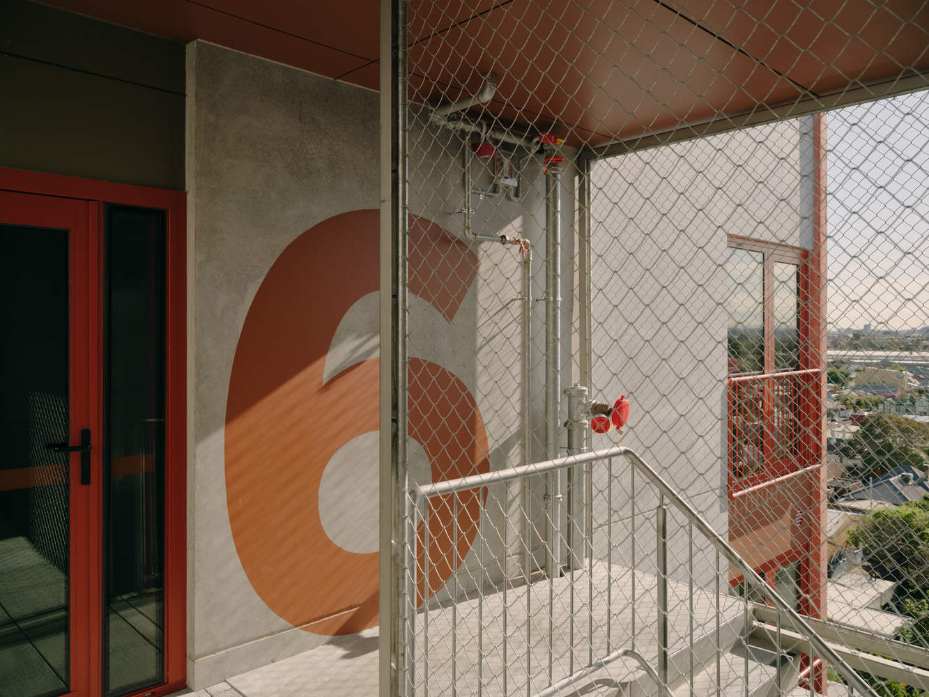 A generative gesture was to tint the grey pre-cast a warm ochre from which we built a tonal palette of orange-red windows, doors and metalwork and terra-cotta painted FC sheet all offset against raw concrete. The walls and ground plane at the base of the building, the principal point of close interaction on the street, are clad in the familiar pressed-red bricks of 19th-century Melbourne. All elements are arranged with a playful approach, particularly on our west façadewhich has a friendly personality generated by its mega-scale zoomorphic composition. This western façade is visible from a great distance over Brunswick and as the western sun hits it in the afternoon, it glows warm and friendly.