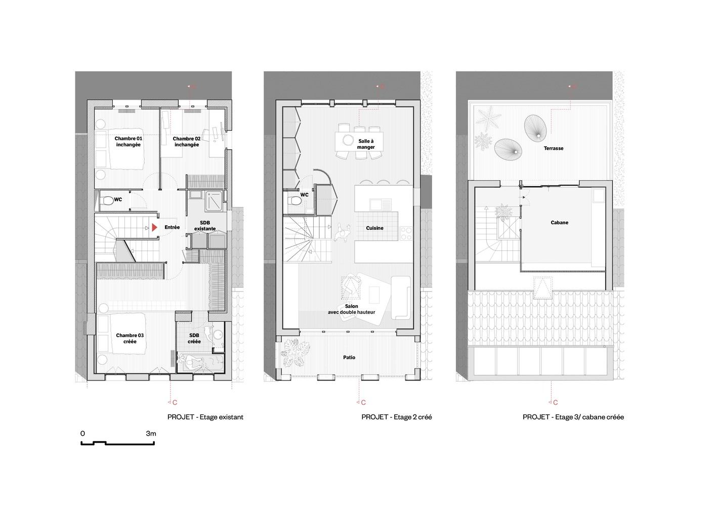 Text description provided by the architects. The project involves the rehabilitation and elevation of a townhouse that was already raised in the 1950s, characterized by a cantilevered section in the heart of the block and a setback on the street side, in accordance with the evolutions of the local urban plan (PLU).