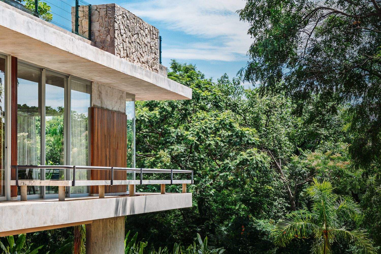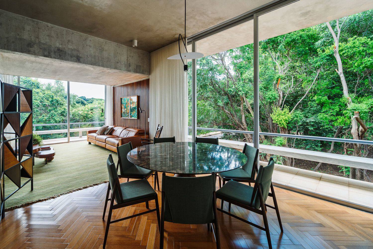 Text description provided by the architects. Three, a numerical symbol that inhabits the horizon of connections. The forest house, with its three floors, hides among the vegetation while simultaneously opening up to it. Through its recessed glass, the observer contemplates the surroundings, and as they wander, they traverse long patios that connect the interior and exterior simultaneously. On a 12x30 meter plot, with setback requirements and the dream of a construction that encompasses the client’s entire program of needs, we faced a challenge that transformed into a production of meanings, textures, and studies.