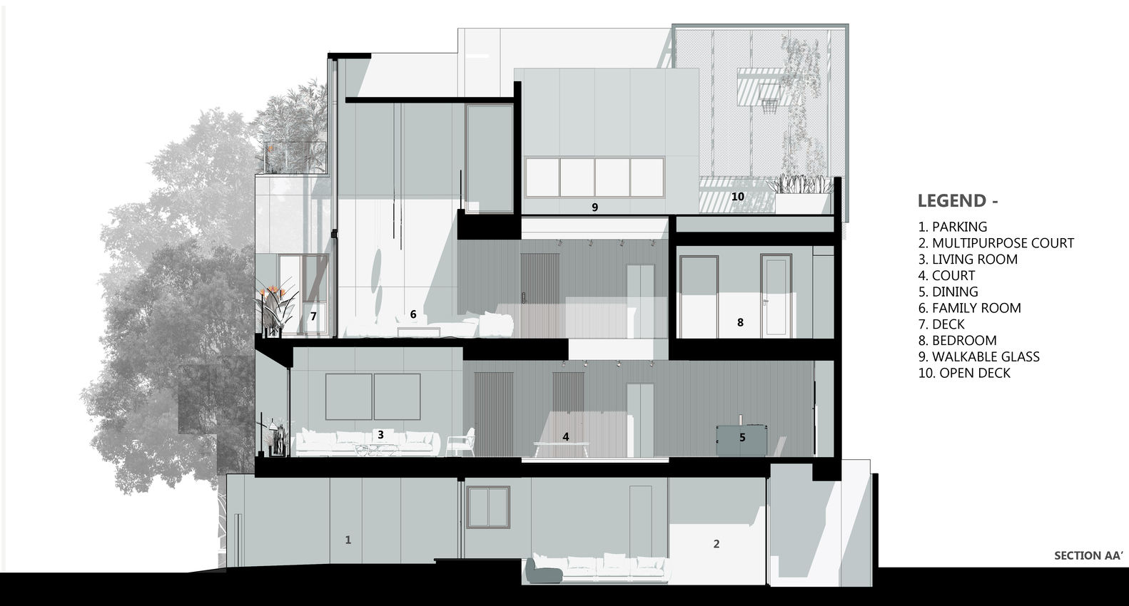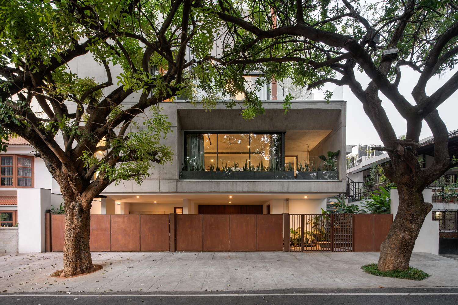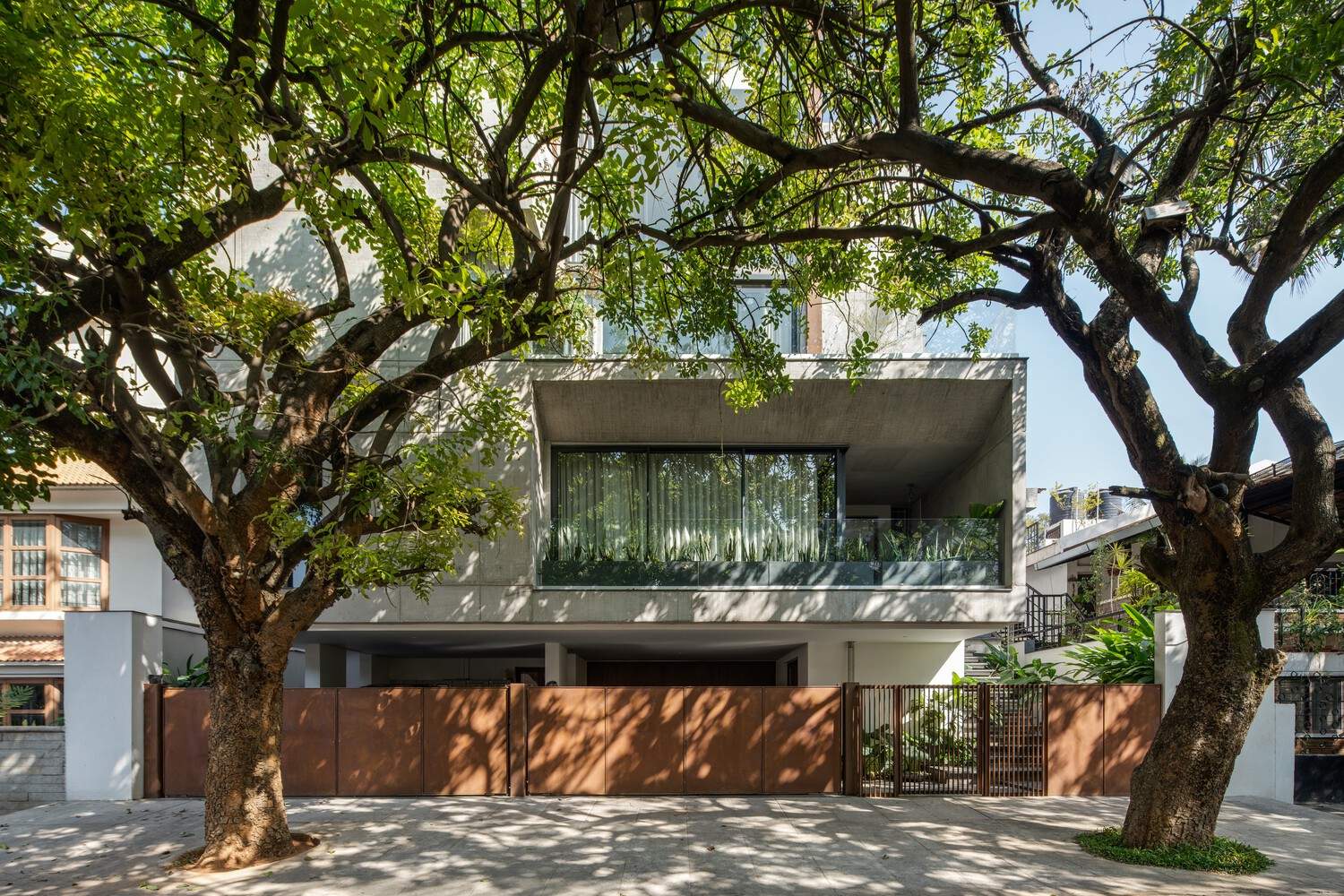 The site located in a leafy suburb with detached houses in Bangalore is south-facing with two sausage trees on the footpath abutting the road. The positioning of the building and its internal zoning were dictated by these trees and the site orientation. A direct relationship between the inside and outside of the house is established due to two longitudinal zones of spaces located in the east and west. The zone on the west houses the programs that need enclosure and privacy while the zone on the east is predominantly open allowing for axial connection from the rear of the house to the front. The eastern zone is sectionally modulated to allow for lateral connection between various levels of the house.