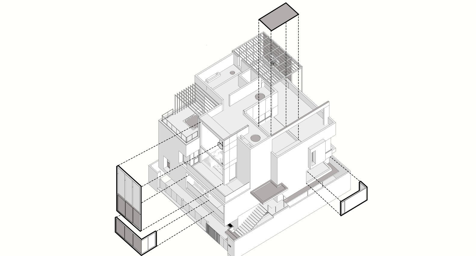 The main areas of the house operate in two levels: the first and the second. This elevated condition allows for secondary programs to be tucked beneath or occupied above the volume of the main house. The first two levels house the living, dining, open kitchen, 3 bedrooms, and a courtyard. Three large apertures, two of them facing south and the other facing the sky define the relationship of the house to its surroundings. The second floor of the house connects to the terrace level through a double-height space while the ground floor of the house is detached and connected only through an internal lift access. The rootedness of the house to the context is accentuated by a sunken area and garden on the ground. This move also allows for modulation in the ceiling height for larger programmatic spaces. Black-clad granite walls and black kadapa flooring in the perimeter of the sunken zone and garden with pergola-lined slits add to the idea of inhabiting an excavated cavernous space. Large sliding folding doors enclosing this area from the parking side allow for the space to open up or be limited based on the client's requirement.
