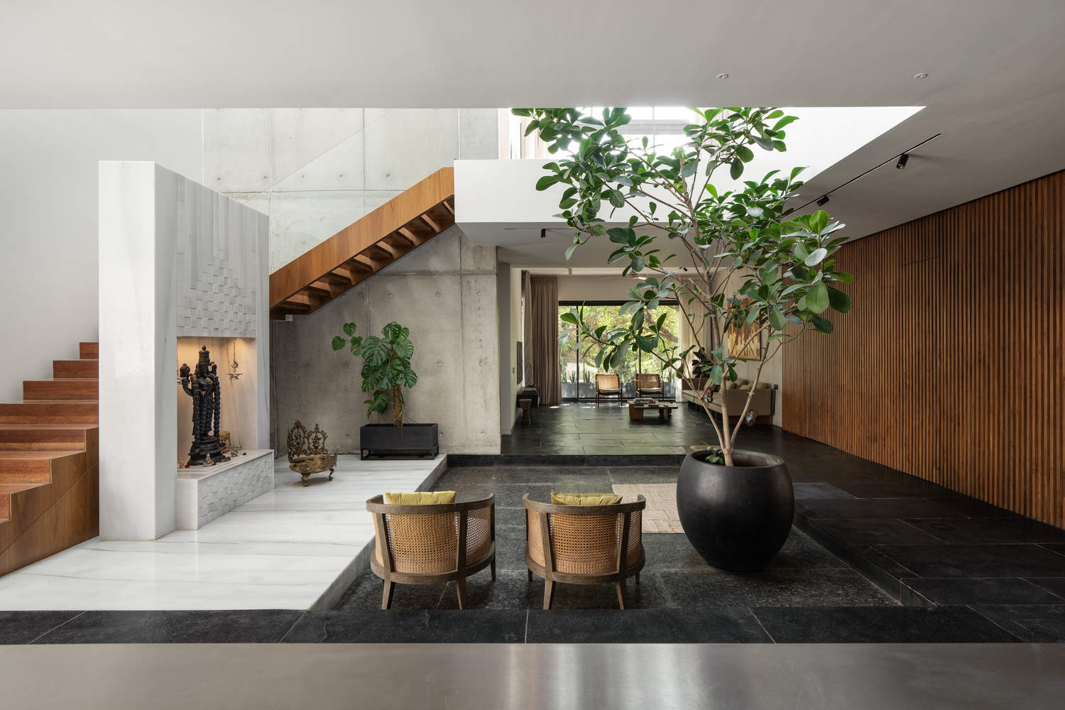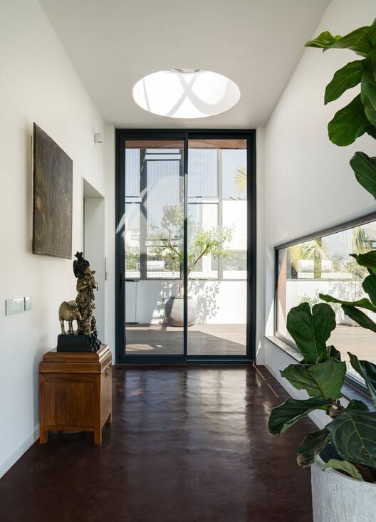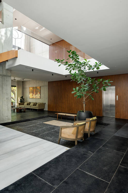 The living room on the first floor is accessed through a set of cantilevered bars acting as stairs that provide relief and a green visual in the tight-bounded corner in the southeast. The house is designed to reveal a sequence of spaces combining compactness and expansiveness. From the confined foyer, one is led towards a large wood-paneled walled space that limits the western zone from the east. On the left, the living room is situated with a large aperture towards the south framed by the two sausage trees. Onto the right is the courtyard with the aperture towards the sky that allows for constant light deep into the house independent of the vagaries of direction. Mat black floor along with a semi-smooth texture of form-finished concrete, smooth wood-paneled walls, and white surfaces absorb and reflect light from these apertures to create a Chiaroscuro effect in a poetic way. The trees on the south cast playful shadows onto the interiors.